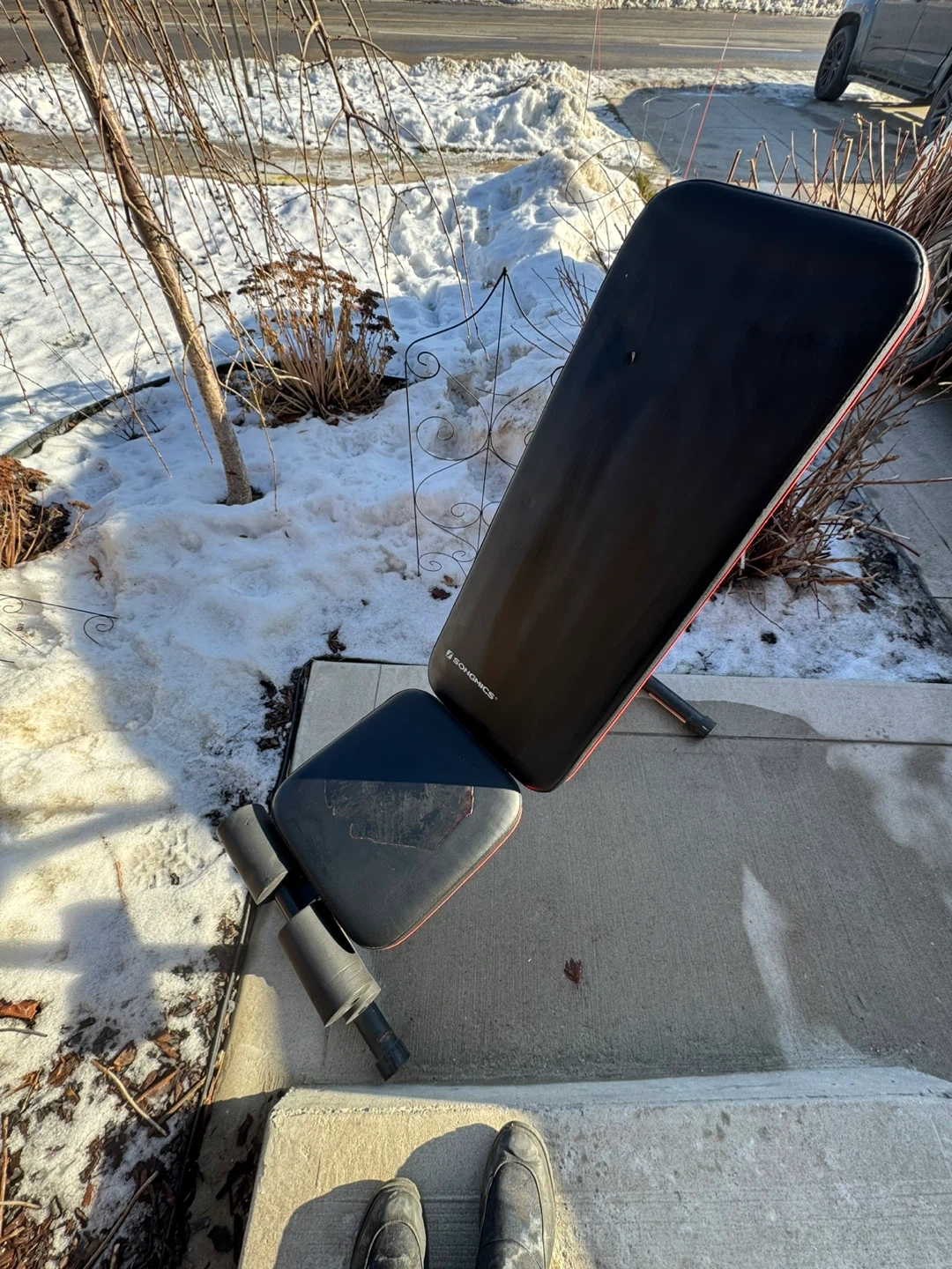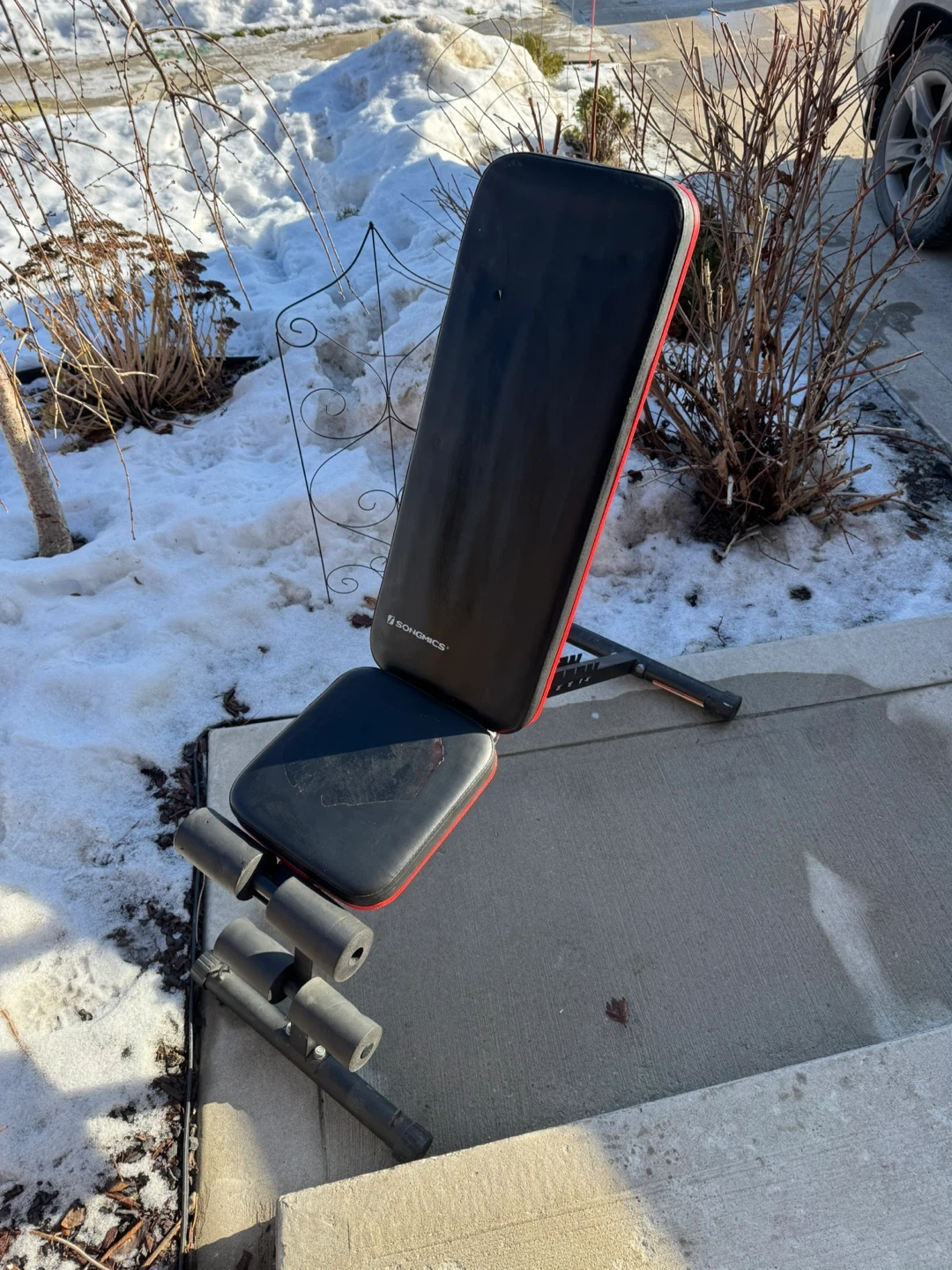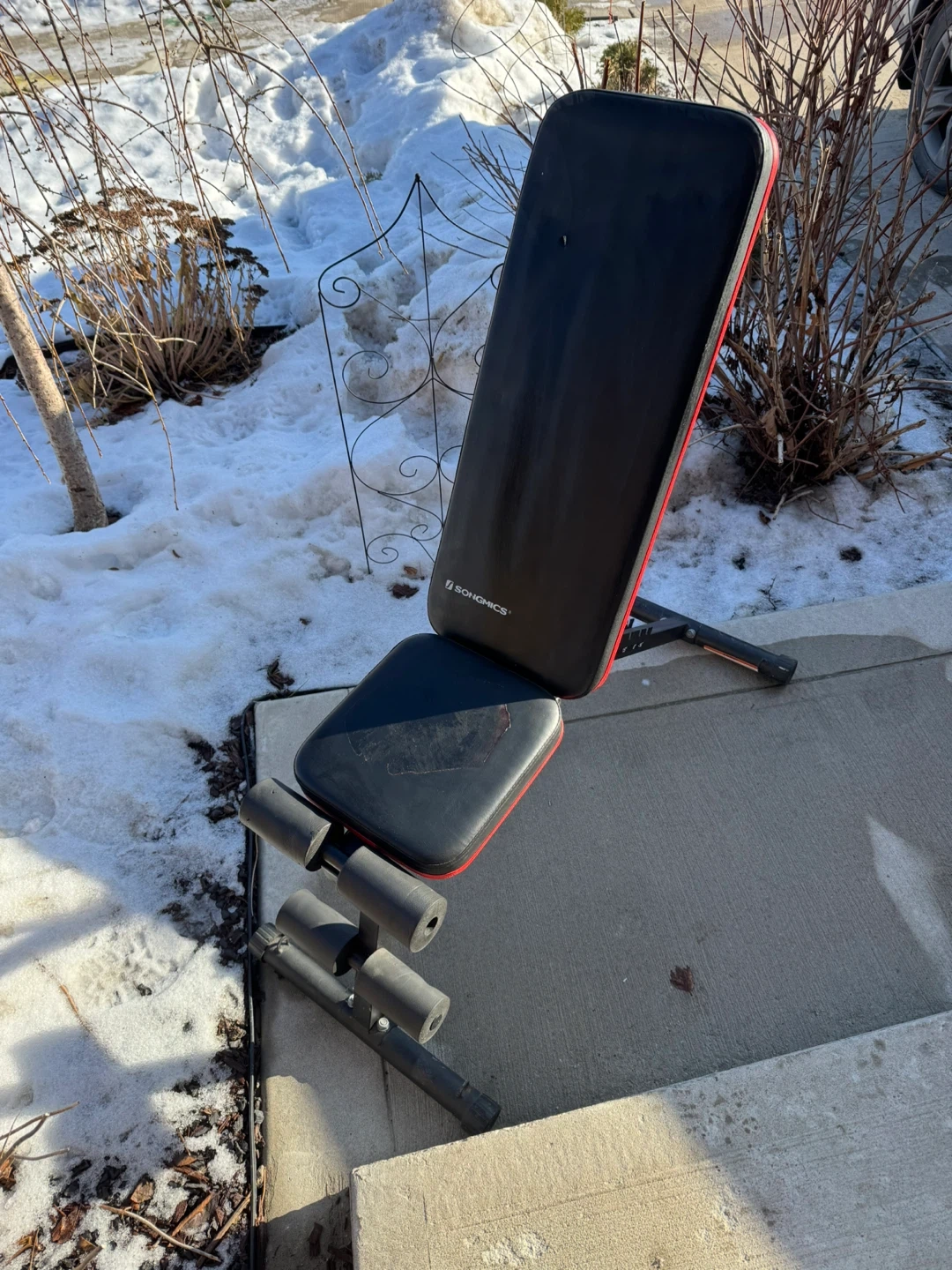 This SONGMICS adjustable weight bench is great for home workouts. It's built with a sturdy frame and comfortable padding. Bench is black with red trim.