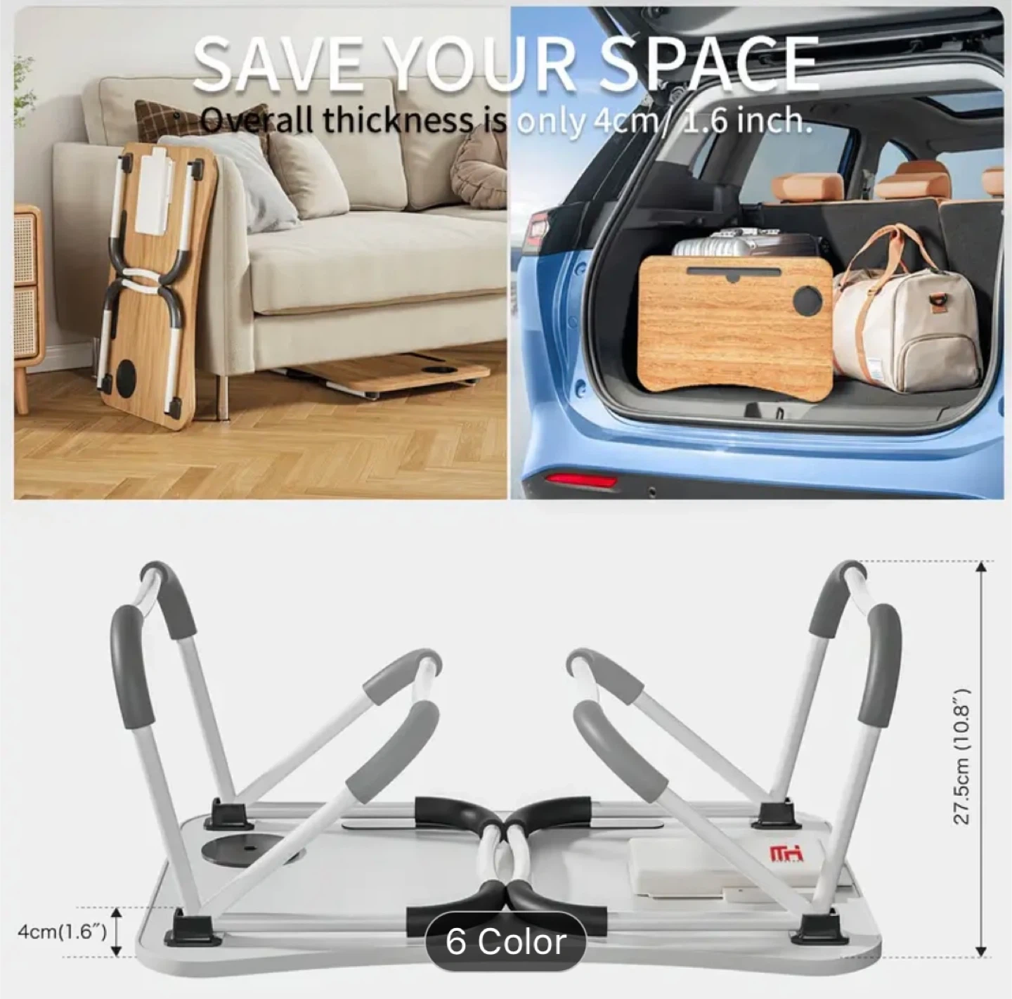 This foldable lap desk is designed for convenience and portability. It features a durable wooden surface in a walnut beige finish and sturdy metal legs that fold flat for easy storage. The desk includes a built-in slot for tablets or books and a cup holder. Its compact size makes it great for working or studying from bed, the couch, or even on the go.