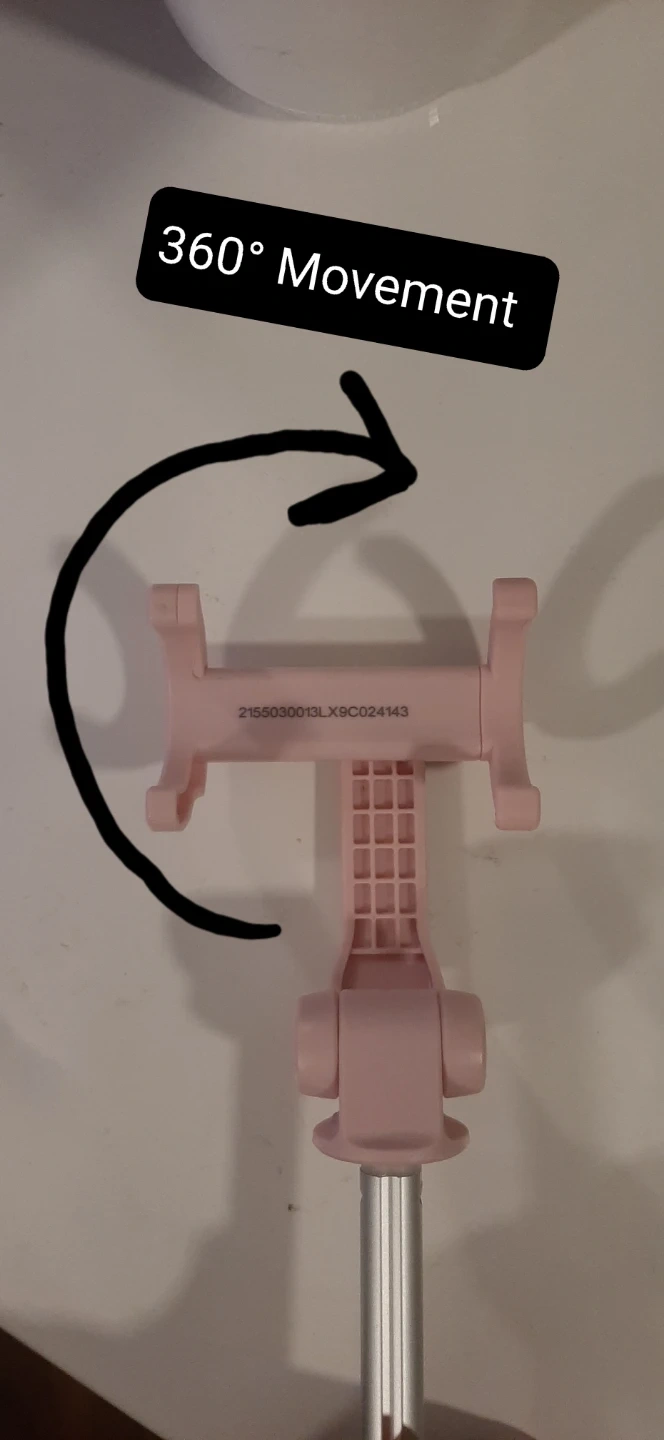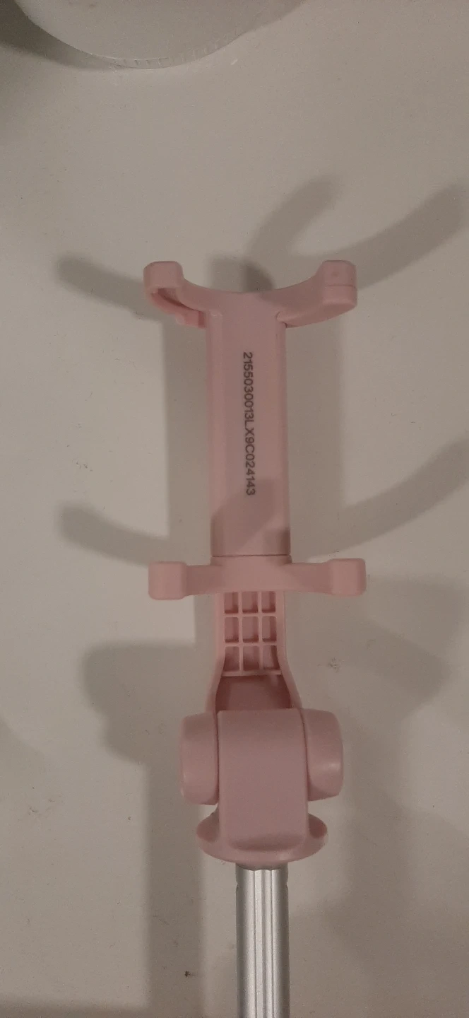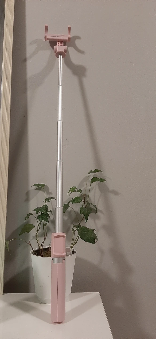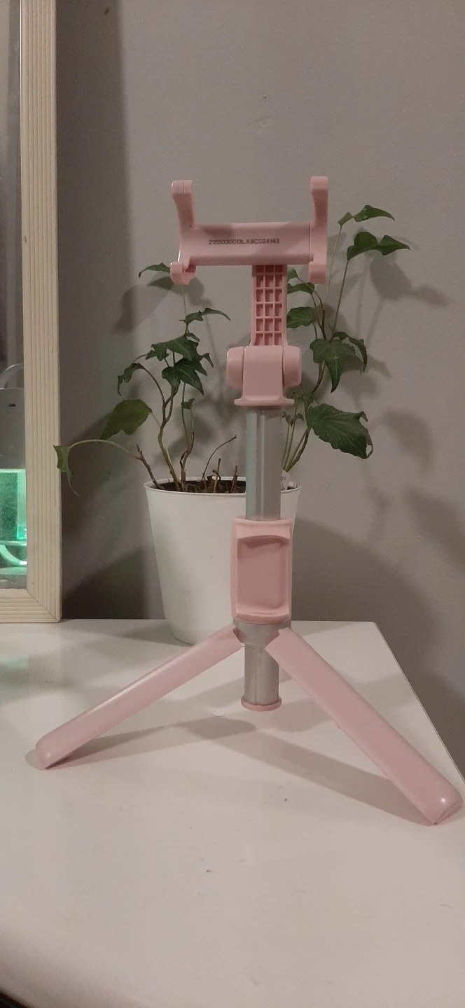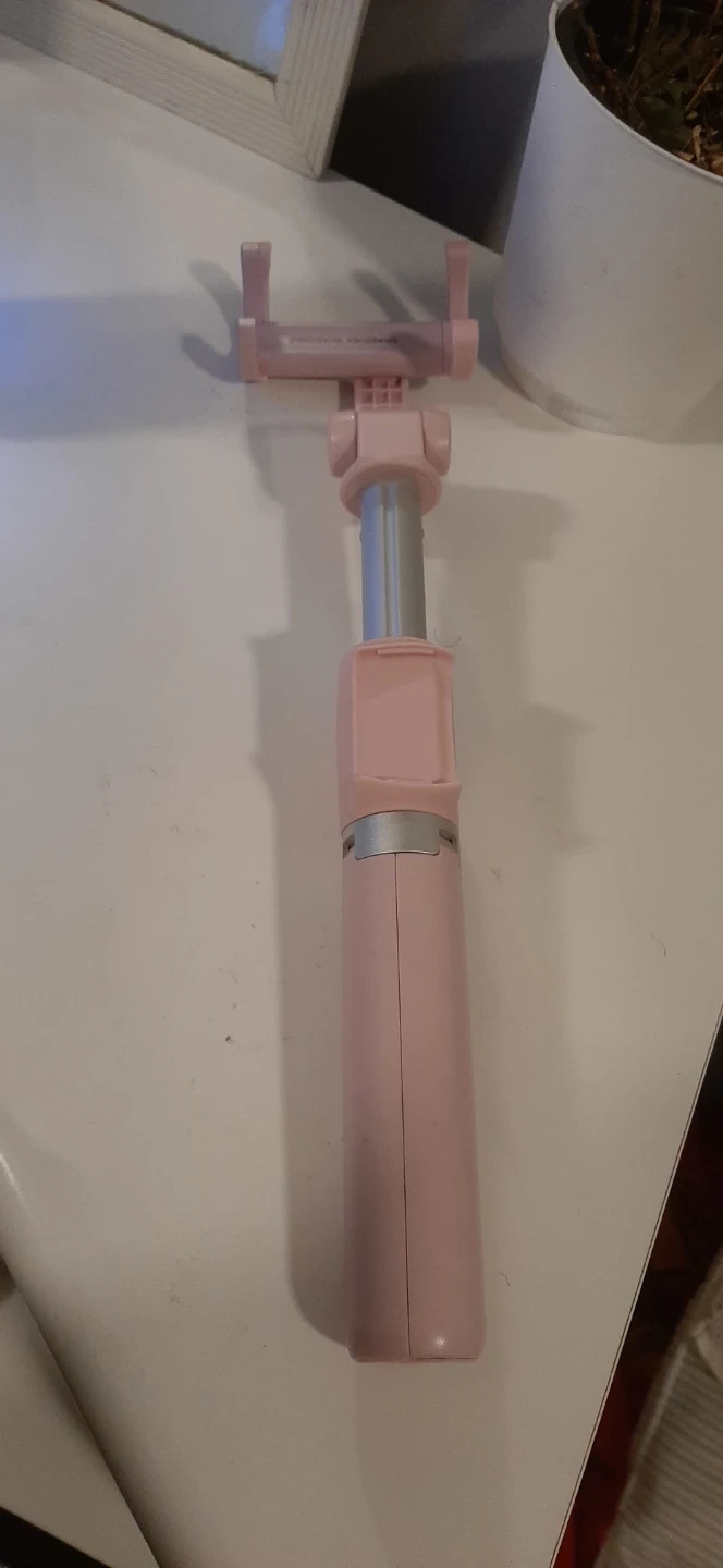 This versatile pink selfie stick extends and can be used as a tripod. It offers 360° movement for flexible positioning. Made from durable plastic and metal.