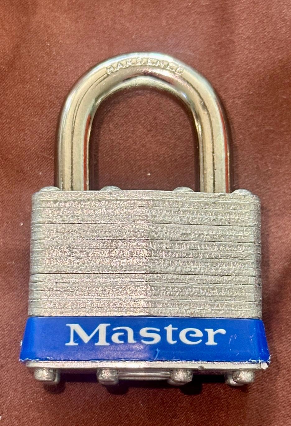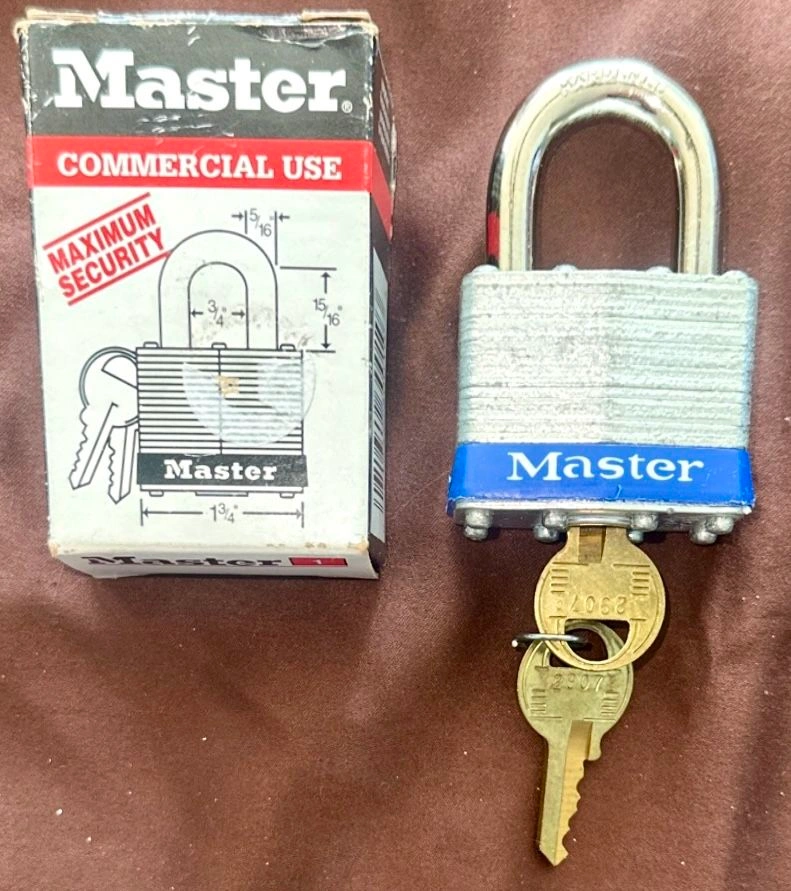 Selling a new Master Lock Maximum Security Commercial Grade Padlock, model #1. It comes in the original box with two keys. This is a laminated steel padlock designed for commercial use and maximum security. Features include a 1-3/4in reinforced laminated steel body and a 15/16in tall, 5/16in diameter hardened steel shackle for cut resistance. The lock has a 4-pin cylinder to prevent picking and dual locking ball bearings for pry and hammer resistance. It also has a rubber blue bumper to prevent scratching and rustproofing for extended wear. I have 3 available. Cash only, buyer must pick up from the Morton Grove Area. Please check out my other listings.
