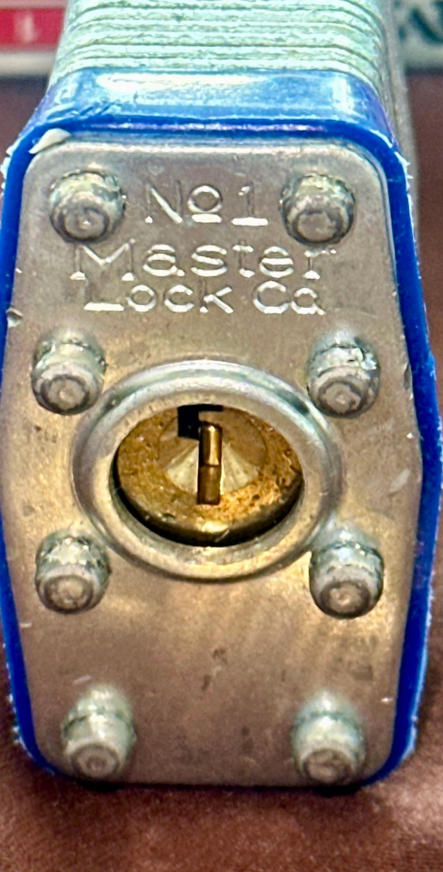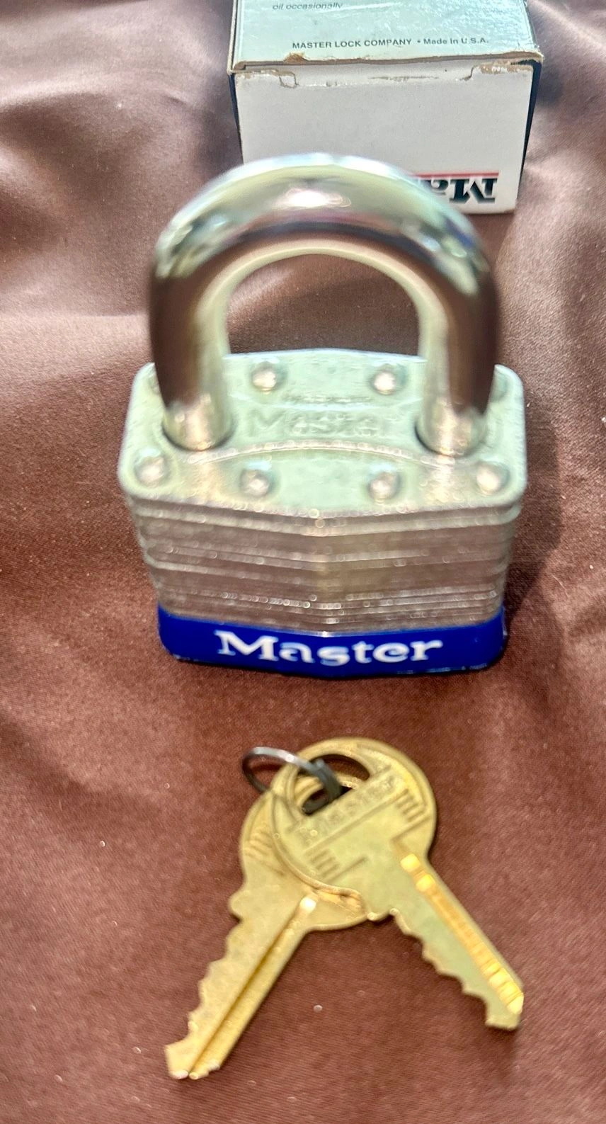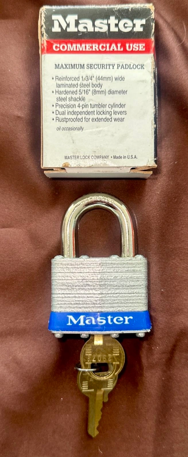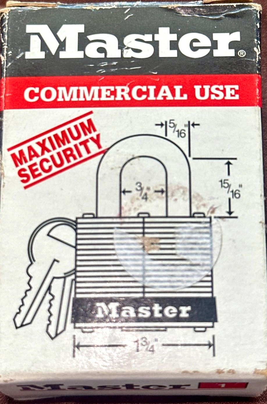Selling a new Master Lock Maximum Security Commercial Grade Padlock, model #1. It comes in the original box with two keys. This is a laminated steel padlock designed for commercial use and maximum security. Features include a 1-3/4in reinforced laminated steel body and a 15/16in tall, 5/16in diameter hardened steel shackle for cut resistance. The lock has a 4-pin cylinder to prevent picking and dual locking ball bearings for pry and hammer resistance. It also has a rubber blue bumper to prevent scratching and rustproofing for extended wear. I have 3 available. Cash only, buyer must pick up from the Morton Grove Area. Please check out my other listings.