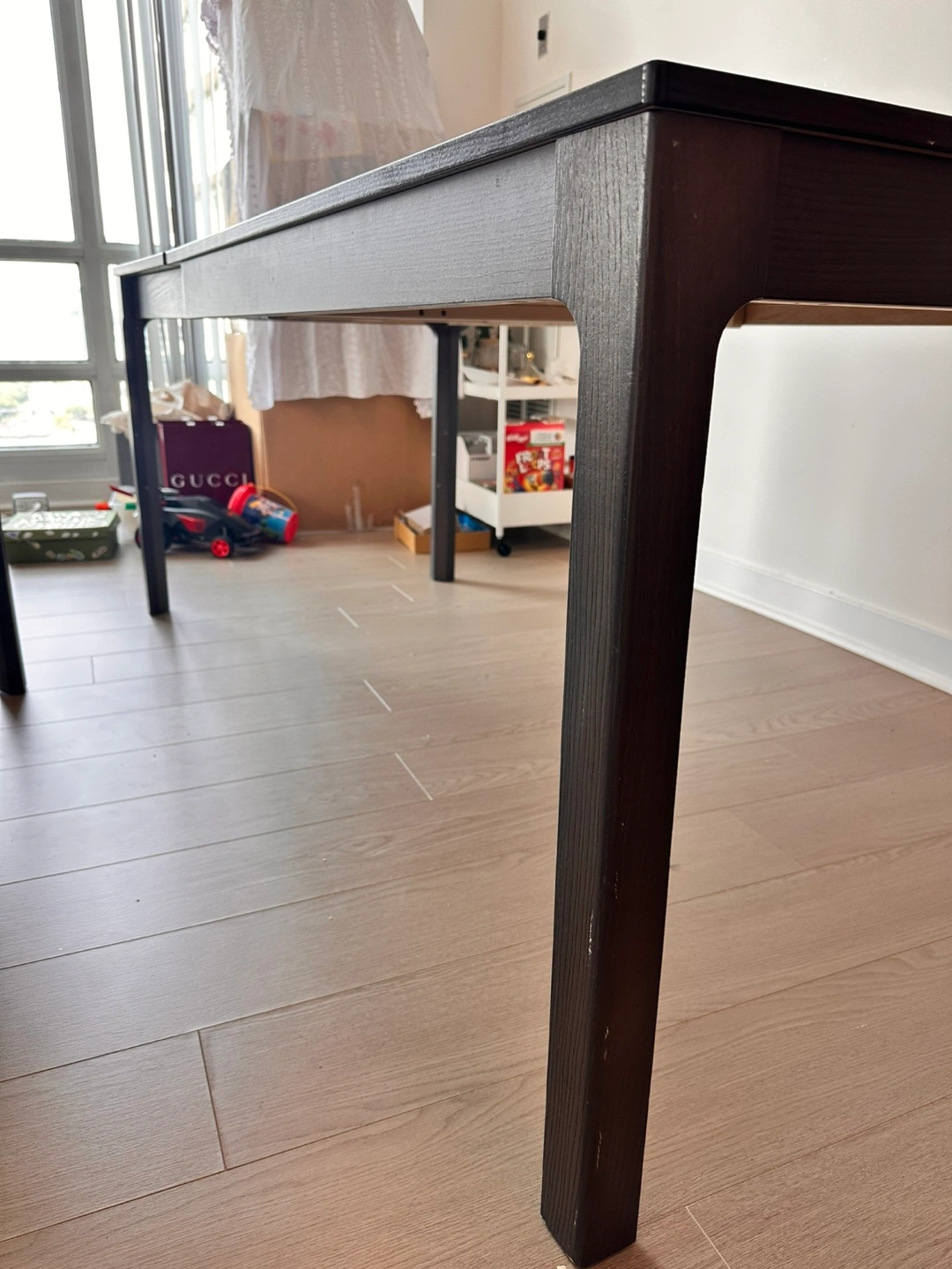 Selling a dark brown extendable dining table. It's in great condition and ready for a new home. Perfect for family dinners or gatherings with friends. The table extends to accommodate more guests, making it super versatile for any occasion