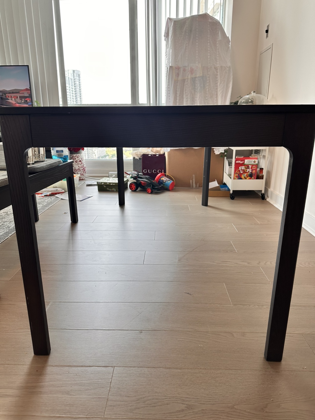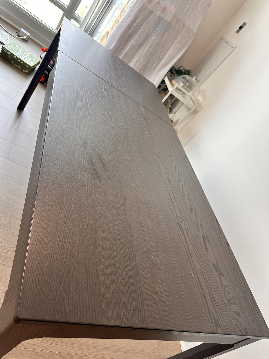 Selling a dark brown extendable dining table. It's in great condition and ready for a new home. Perfect for family dinners or gatherings with friends. The table extends to accommodate more guests, making it super versatile for any occasion