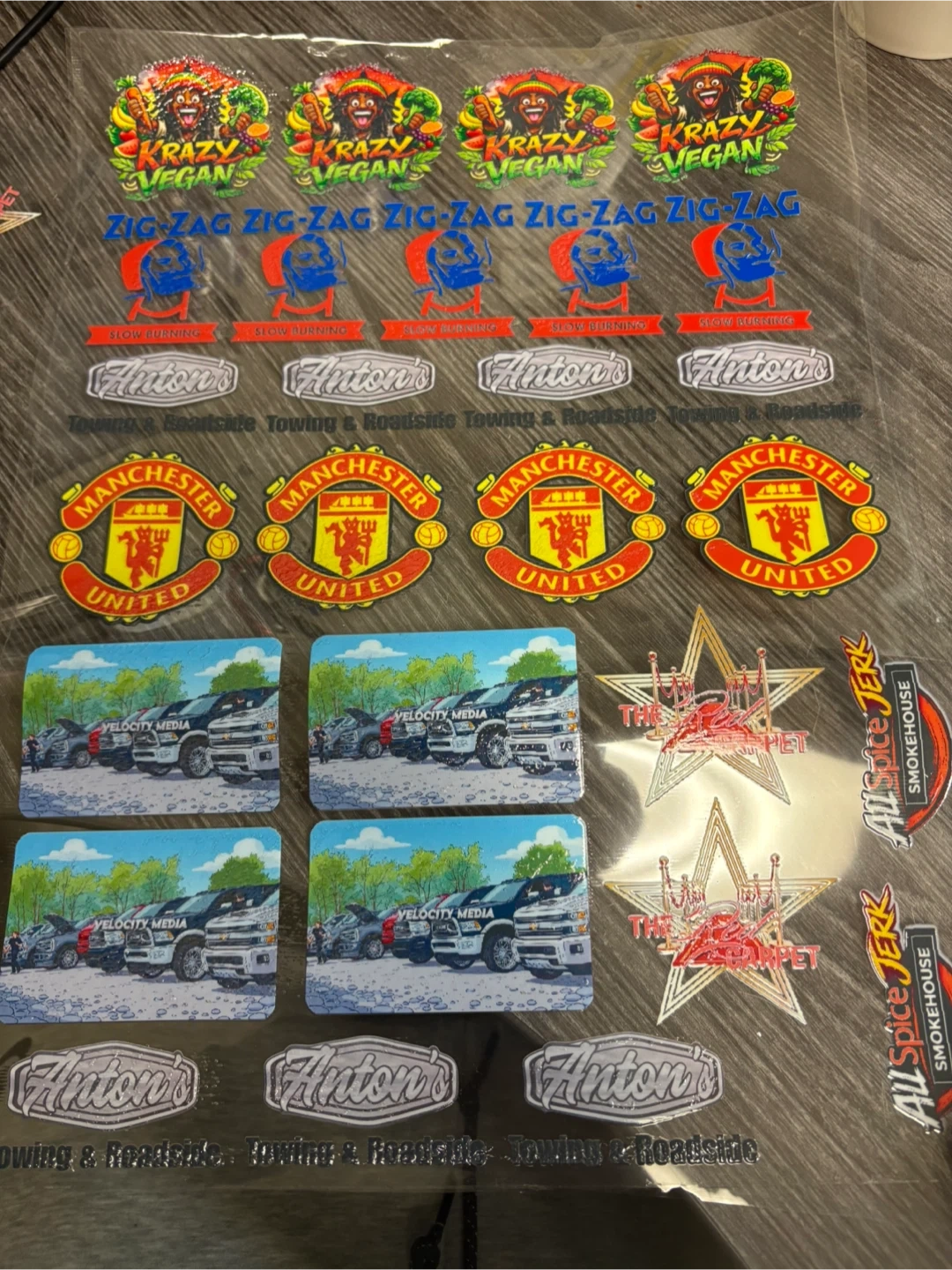 Variety sticker sheet featuring Manchester United crests, Anton's Towing & Roadside logos, Velocity Media vehicle graphics, and more. Includes "Krazy Vegan Zig-Zag" stickers and "All Spice Jerk Smokehouse" designs.