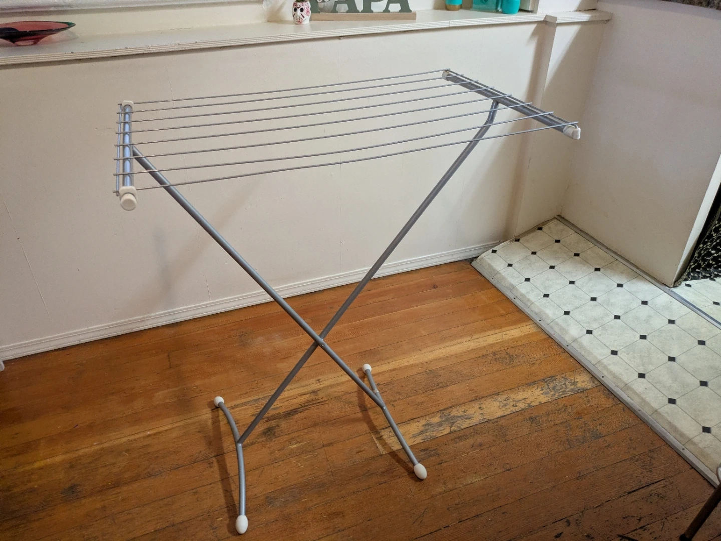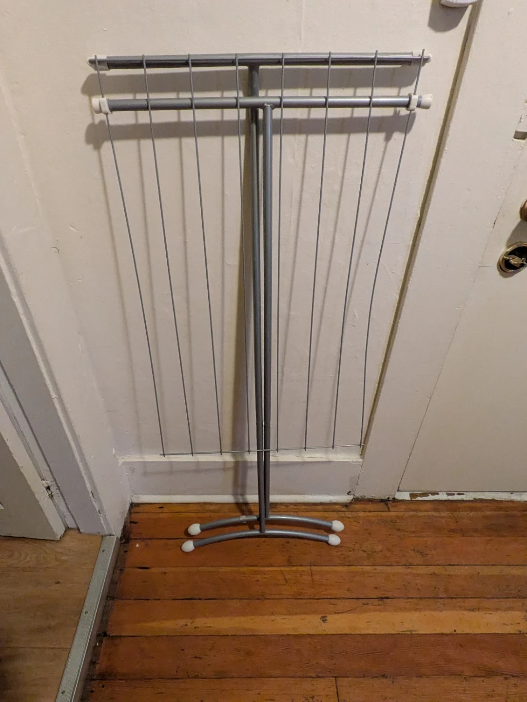 This is a metal collapsible clothes drying rack. It's lightweight and folds flat for easy storage. It's useful for air-drying laundry when you don't have much space. Pick up in the West end of Vancouver