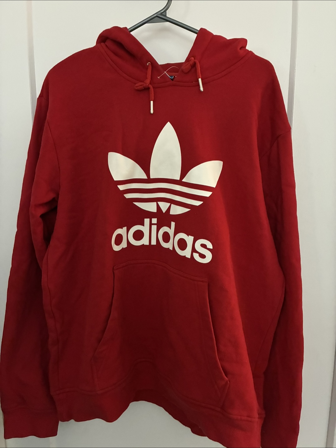 This is a red Adidas hoodie with the classic trefoil logo. It's a pullover style with a front pouch pocket and an adjustable drawstring hood. It's made from a comfortable cotton blend.