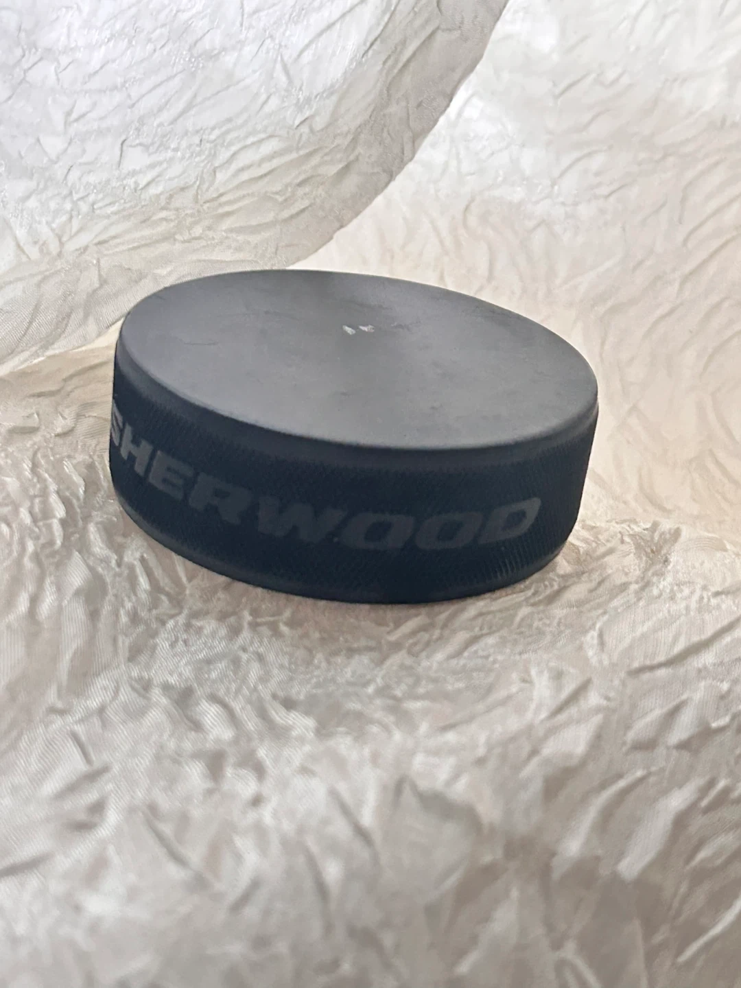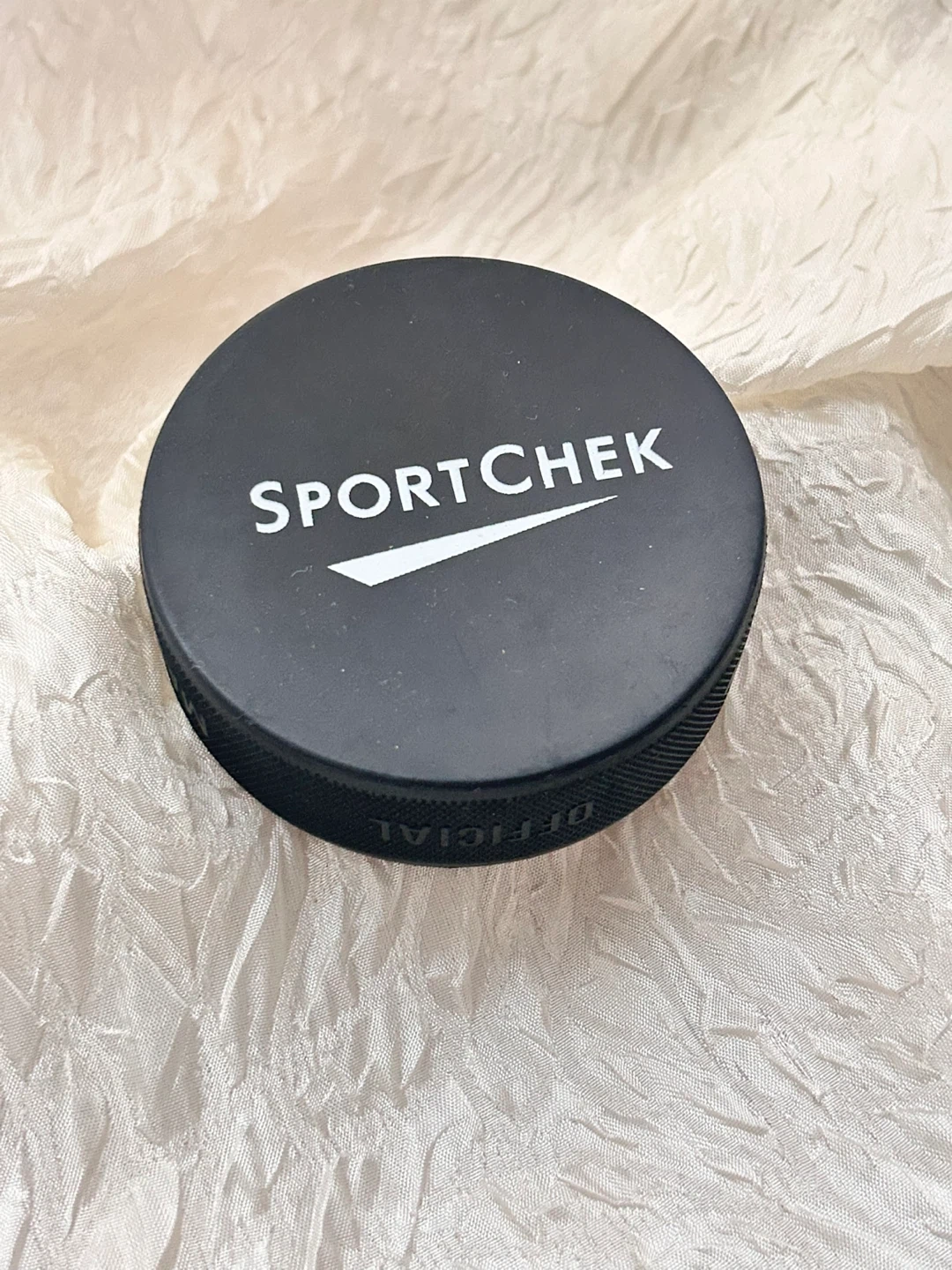 Sport Chek branded hockey puck. Sherwood text is visible on the side. Standard hockey puck size. Never used. π