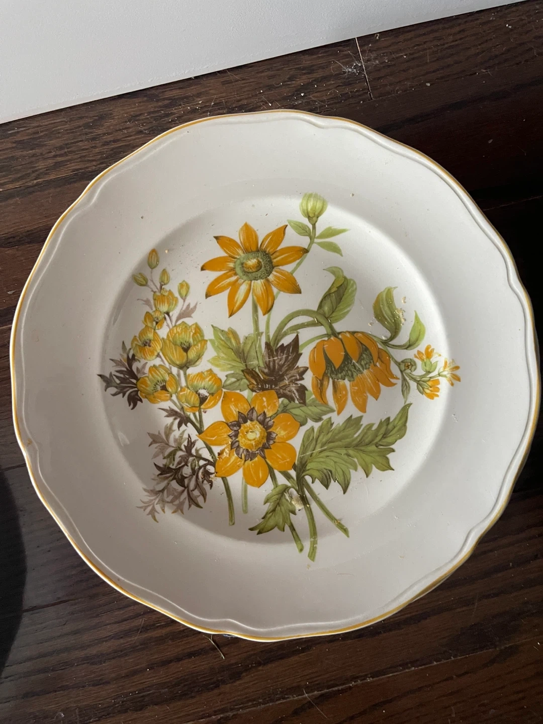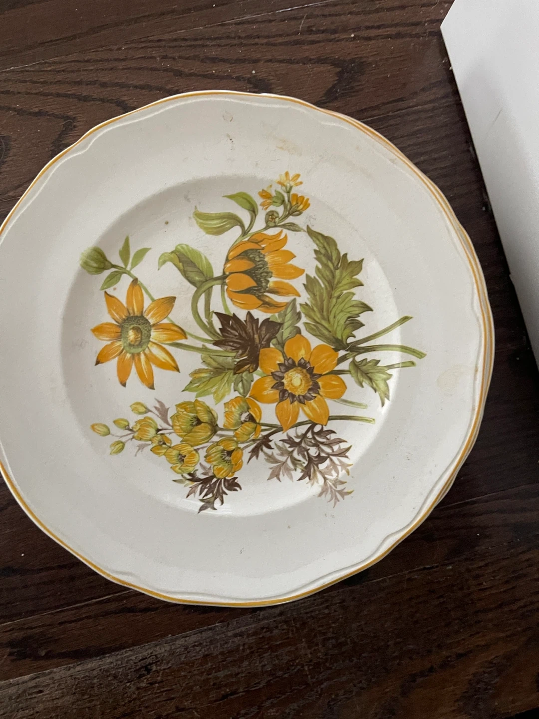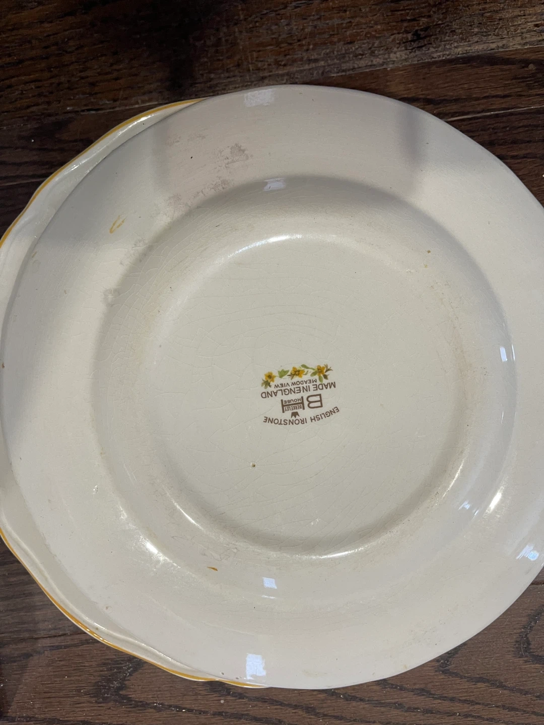 This is a vintage Bristo English Ironstone plate. It features a beautiful floral design with yellow and green tones. The plate has a scalloped edge and a yellow trim. It's made in England.
