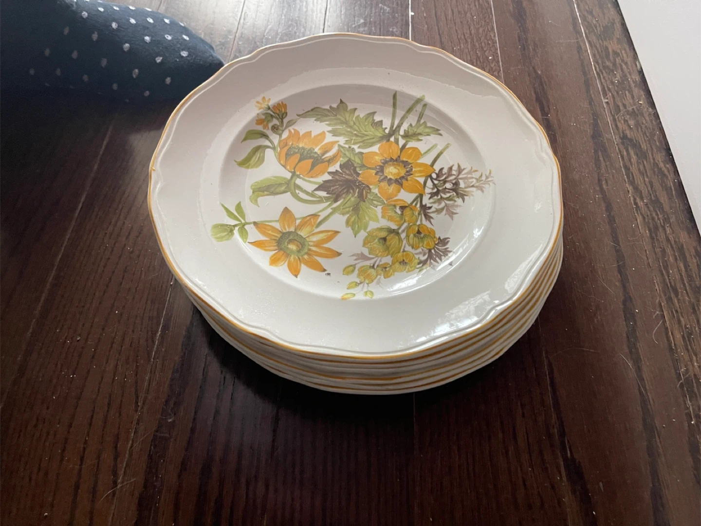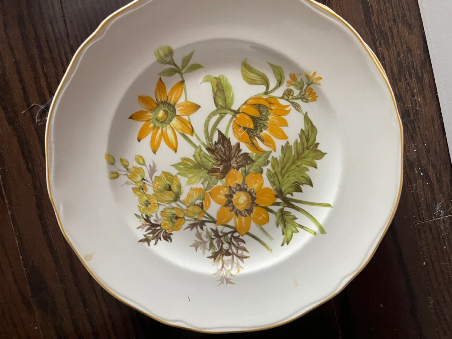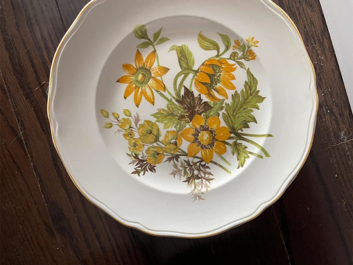 This is a vintage Bristo English Ironstone plate. It features a beautiful floral design with yellow and green tones. The plate has a scalloped edge and a yellow trim. It's made in England.