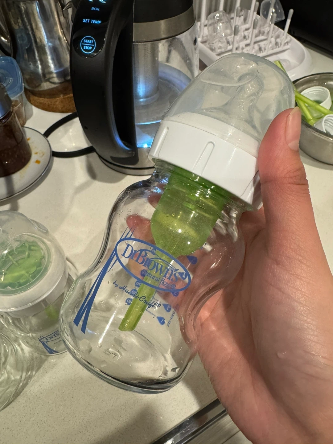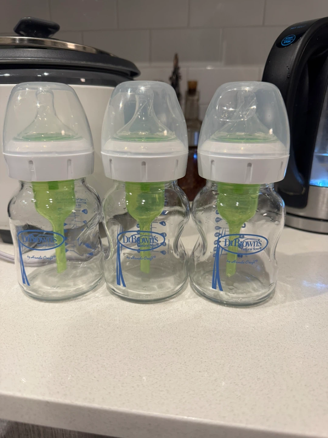 Set of three Dr. Brown's Natural Flow baby bottles. These glass bottles feature the patented internal green venting system. Standard neck design.