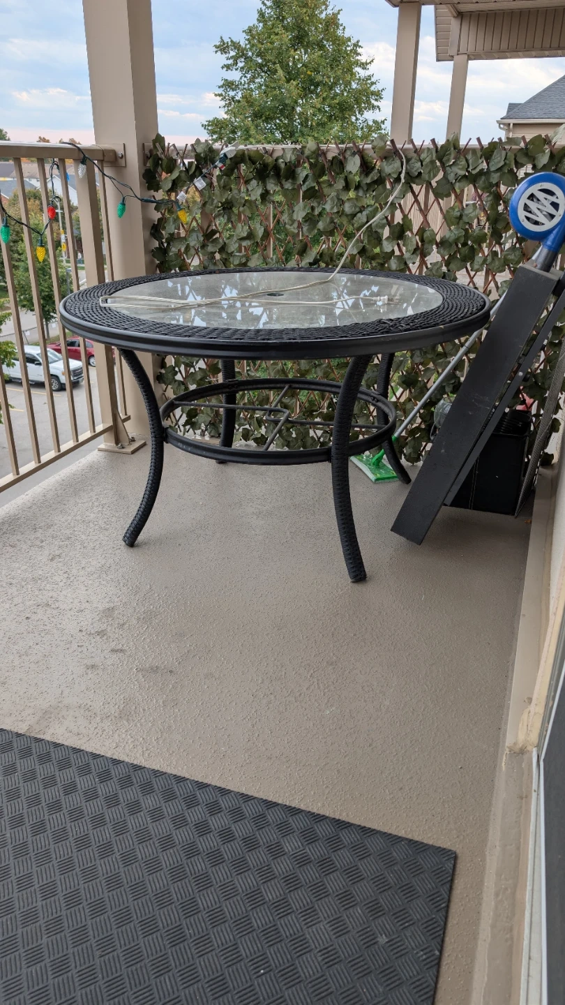 This round patio table features a glass top and a wicker-style frame. It's great for small balconies or patios. Use it for drinks or as a plant stand!
