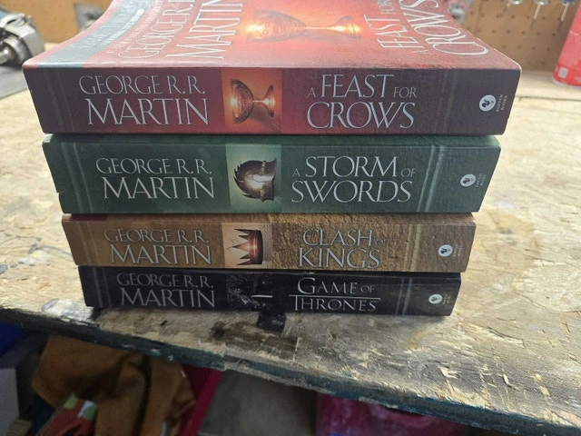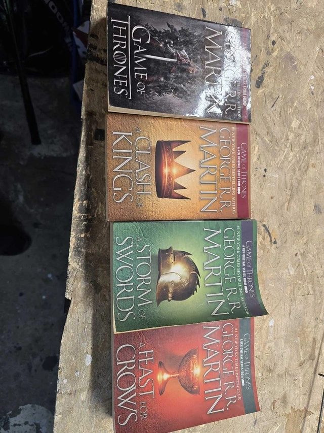 Dive into the epic world of Westeros with this set of George R.R. Martin's 'A Song of Ice and Fire' series, including 'A Game of Thrones', 'A Clash of Kings', 'A Storm of Swords', and 'A Feast for Crows'. Though these books have been enjoyed, they're in good shape to transport you to a land of knights, dragons, and political intrigue. A perfect addition to any fantasy lover's collection! Books in this condition typically sell for $8-$15 each, I have priced it accordingly for the set. If the ad is up, the books are still available, ready to whisk you away on an unforgettable adventure! Cash accepted.