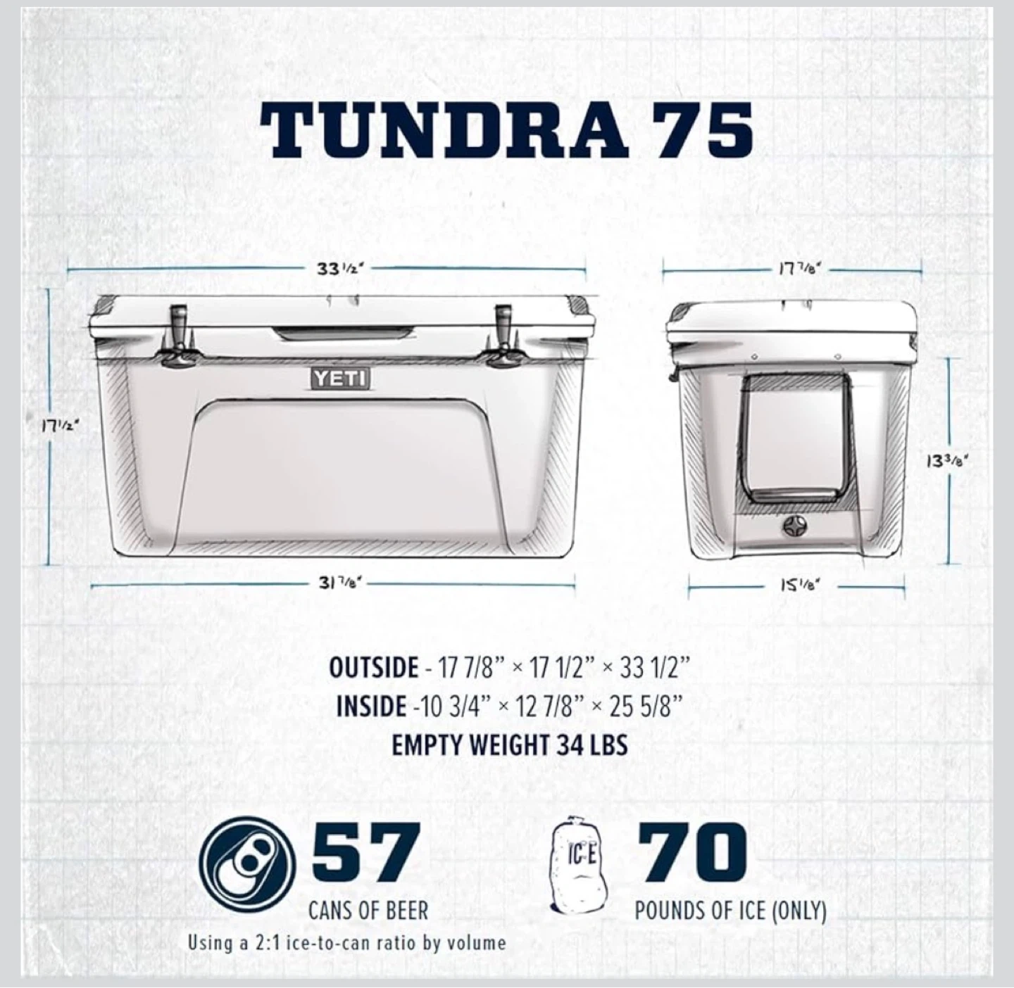 It's designed for durability and ice retention. Outside dimensions are 33 1/2 inches by 17 1/2 inches by 17 1/2 inches. It holds 57 cans of beer or 70 pounds of ice.