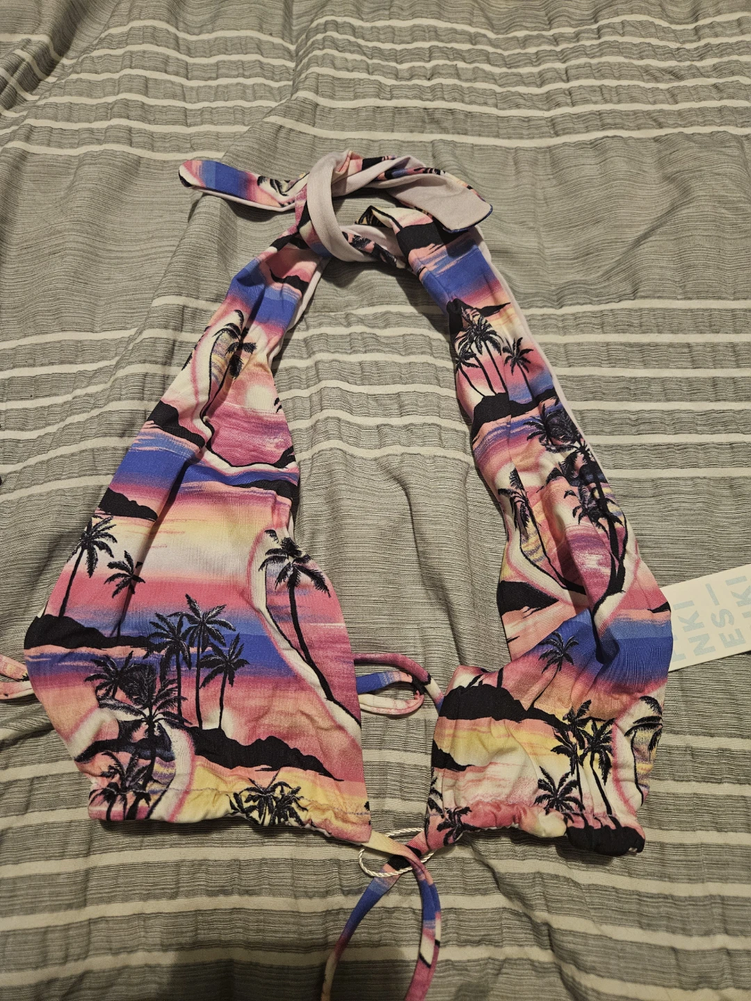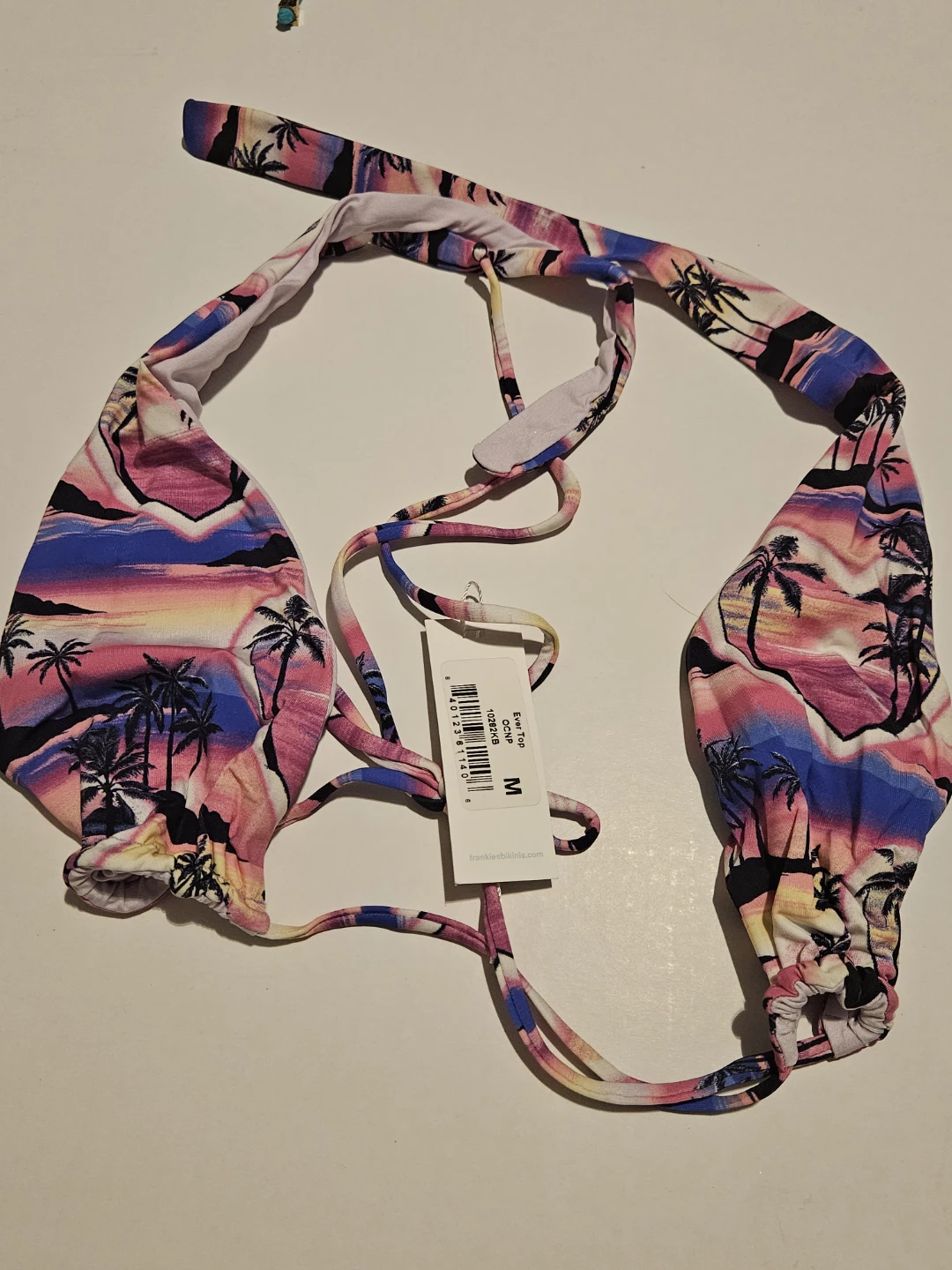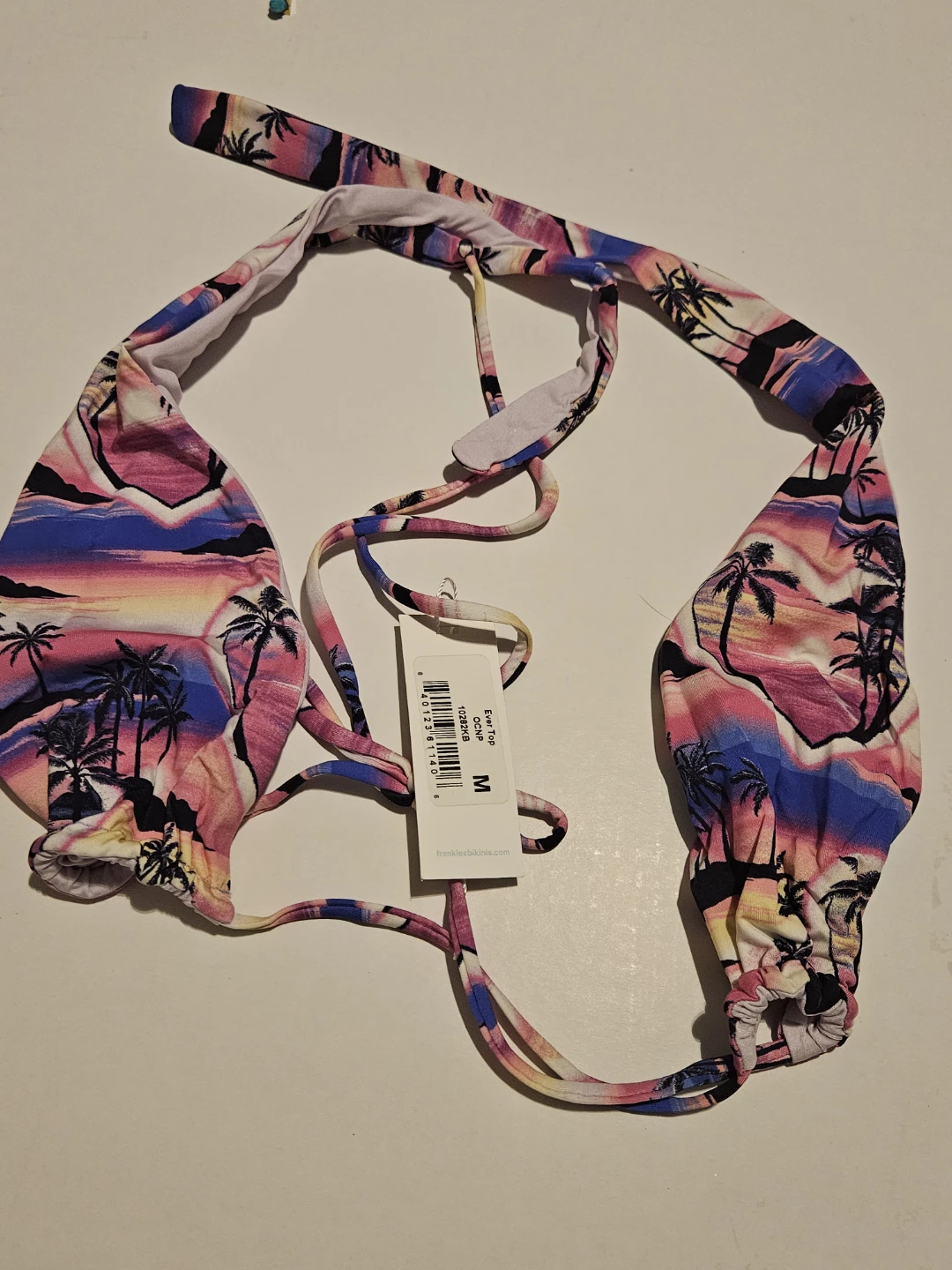 Selling a Frankies Bikinis Ever Top in size M! The top features a beautiful palm tree design with a mix of colors. It's made of 85% nylon and 15% spandex. Perfect for your next beach getaway