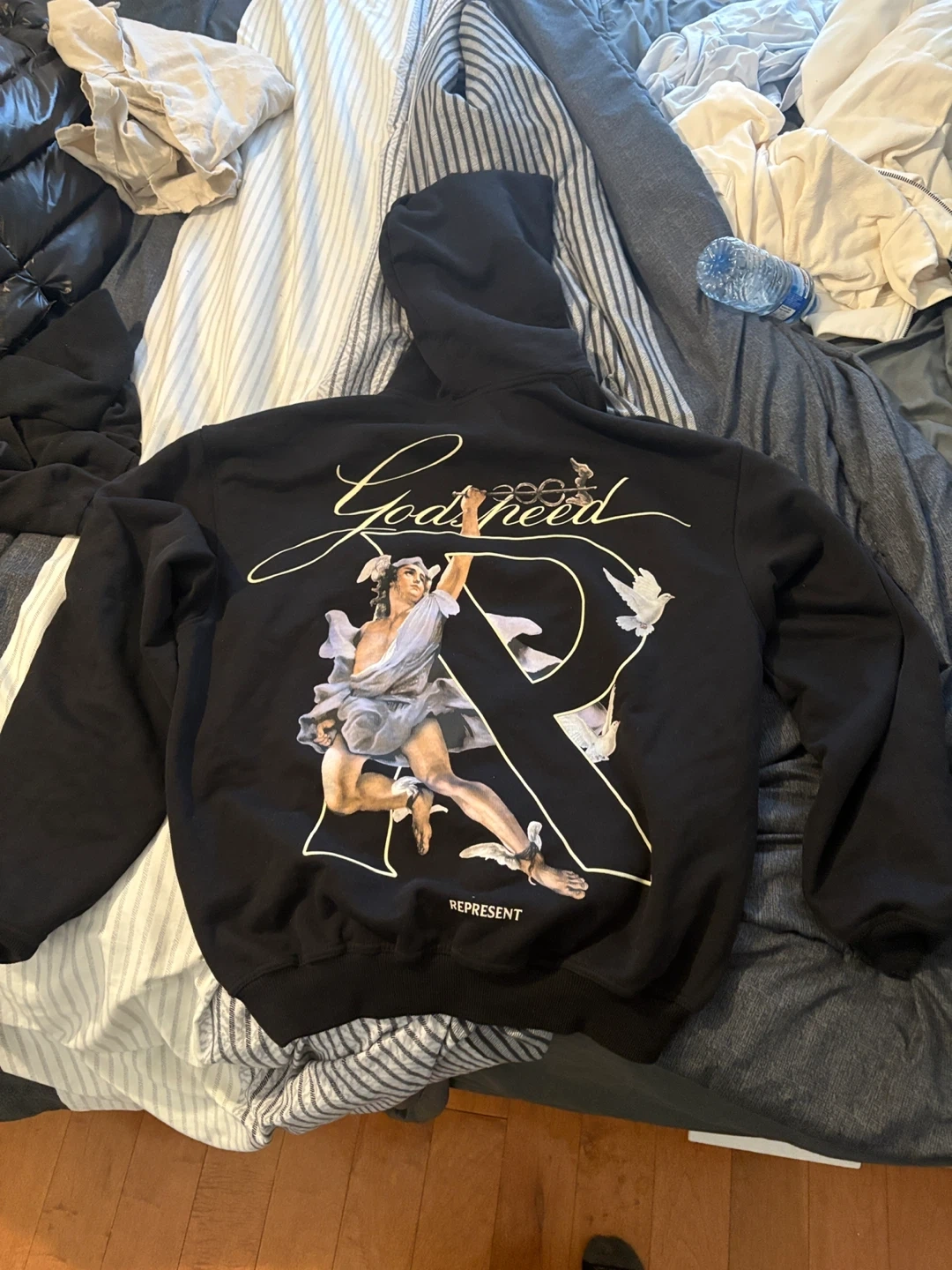 Selling a Represent Godspeed hoodie in black. The design features the 'Godspeed' graphic on the back. Please take a look at the photos for condition and design details