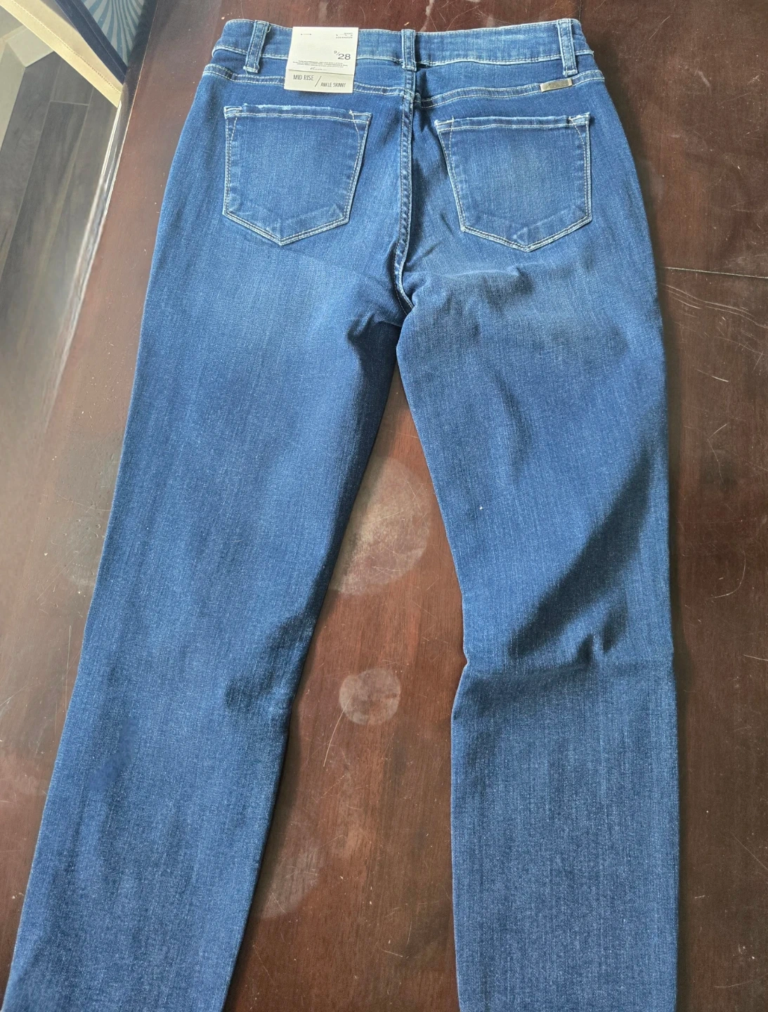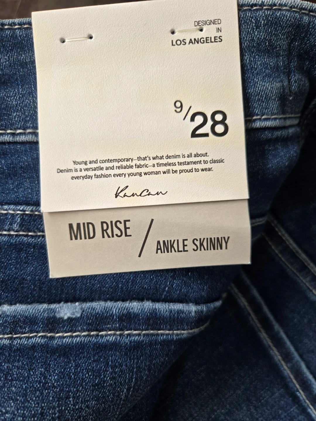 Brand New Never Worn. These Kancan jeans are a mid rise ankle skinny style in a size 9/28. They feature a distressed detail on one leg. Denim is a versatile and reliable fabric.