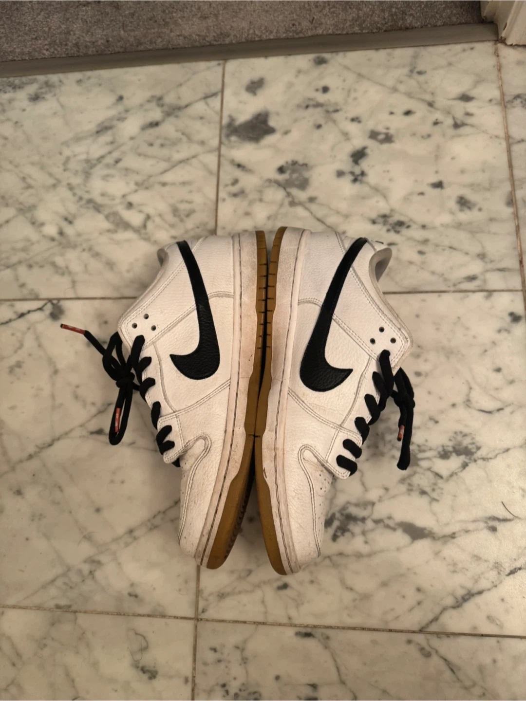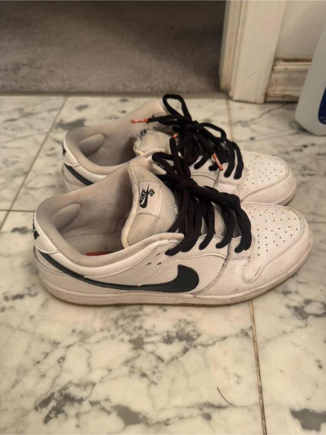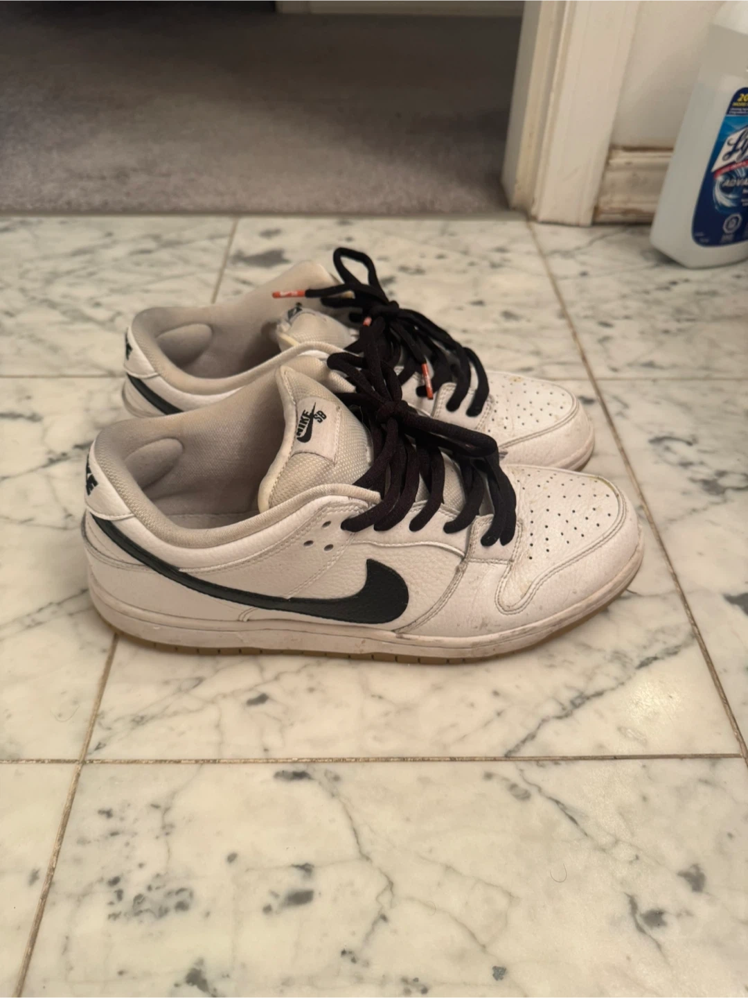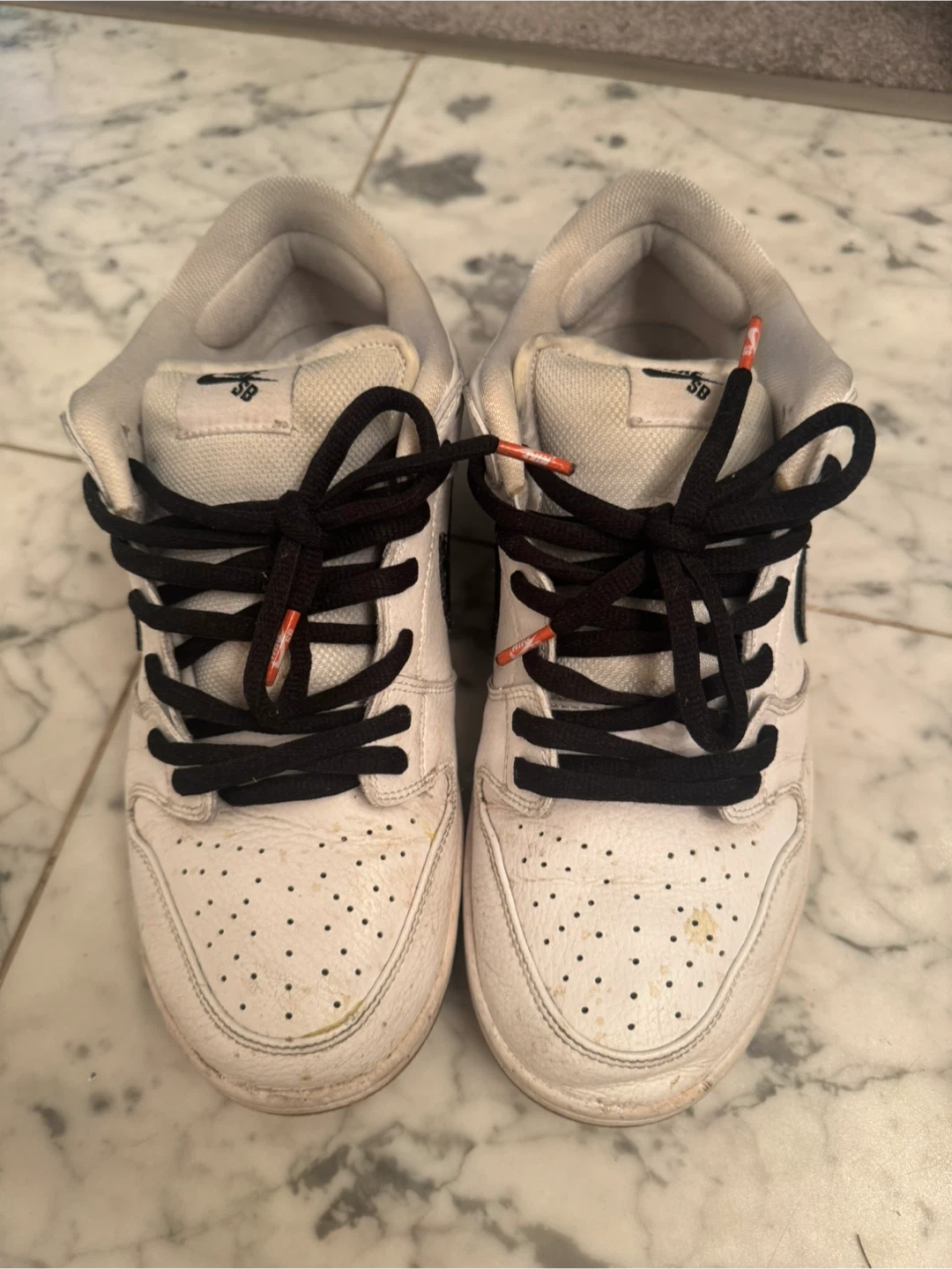 White Nike SB Dunk Low sneakers with black accents. Includes an extra set of white laces in the original Nike SB packaging. These are classic skateboarding shoes.