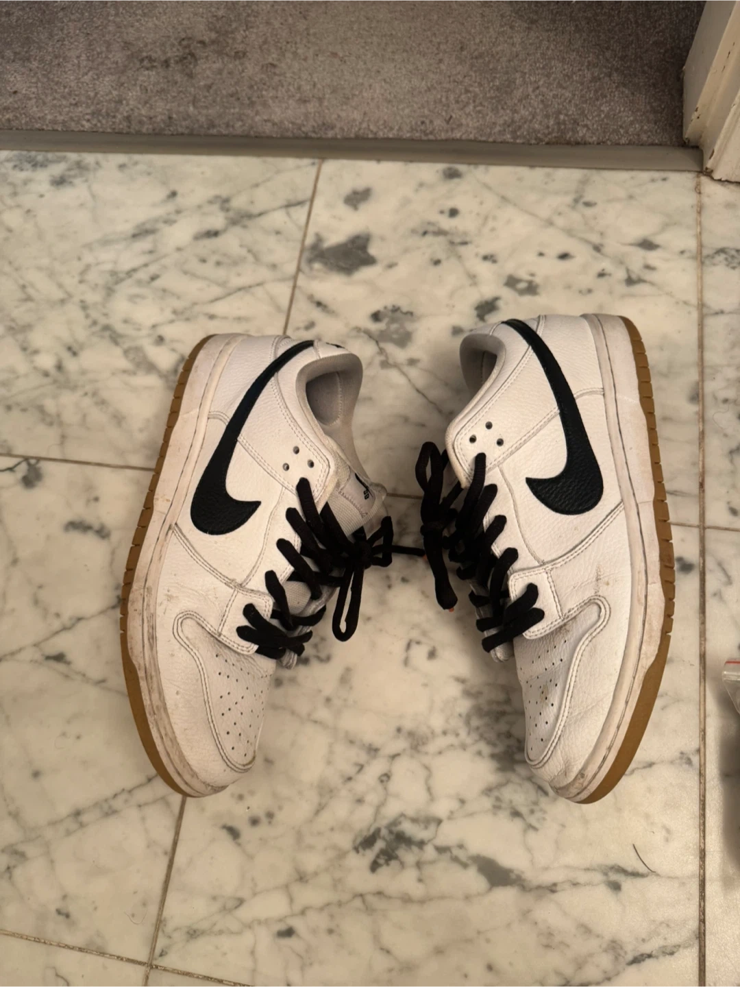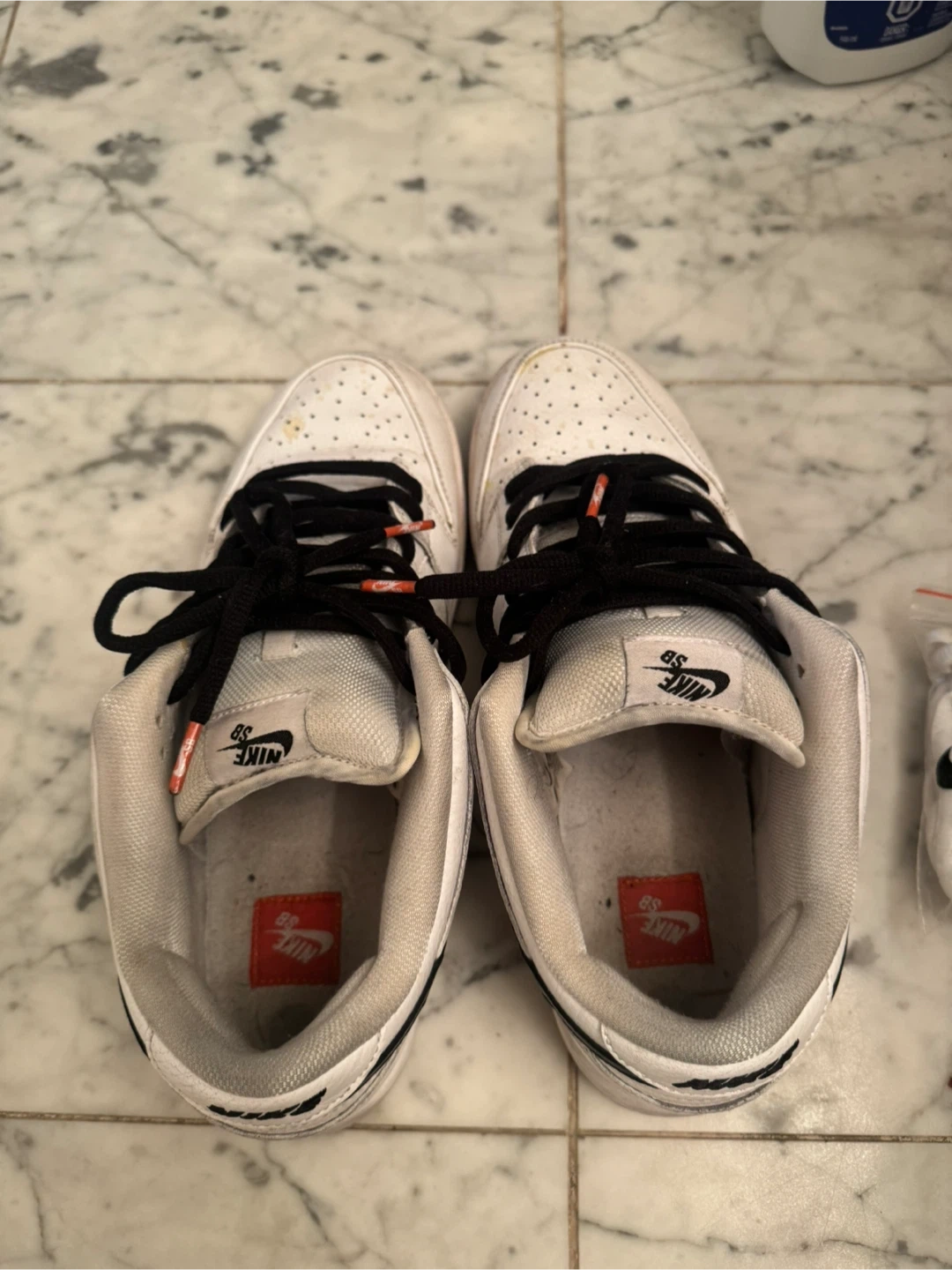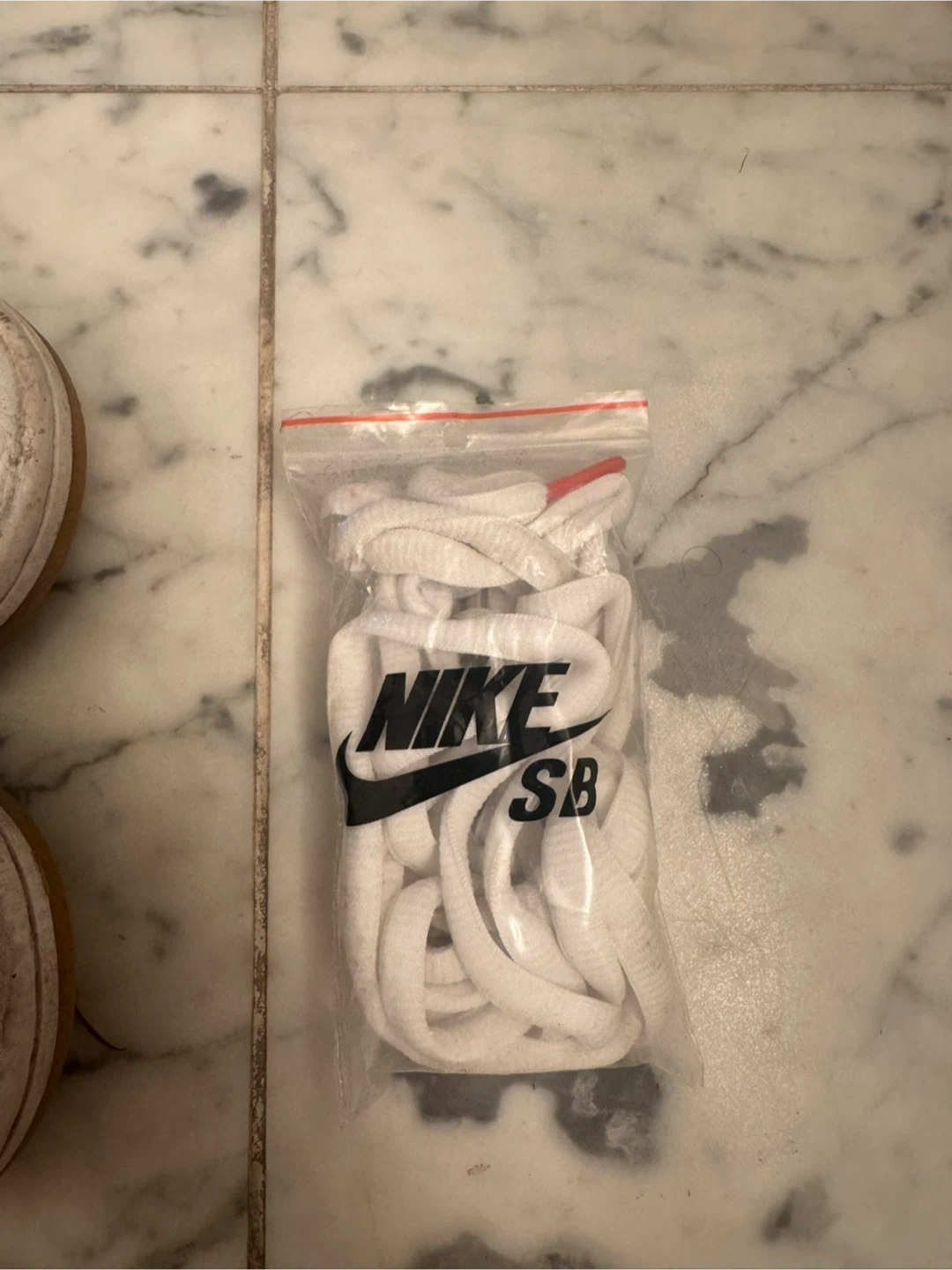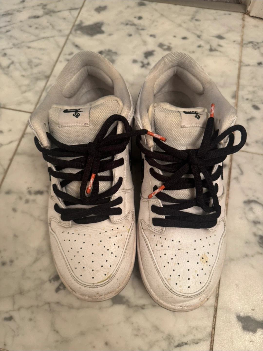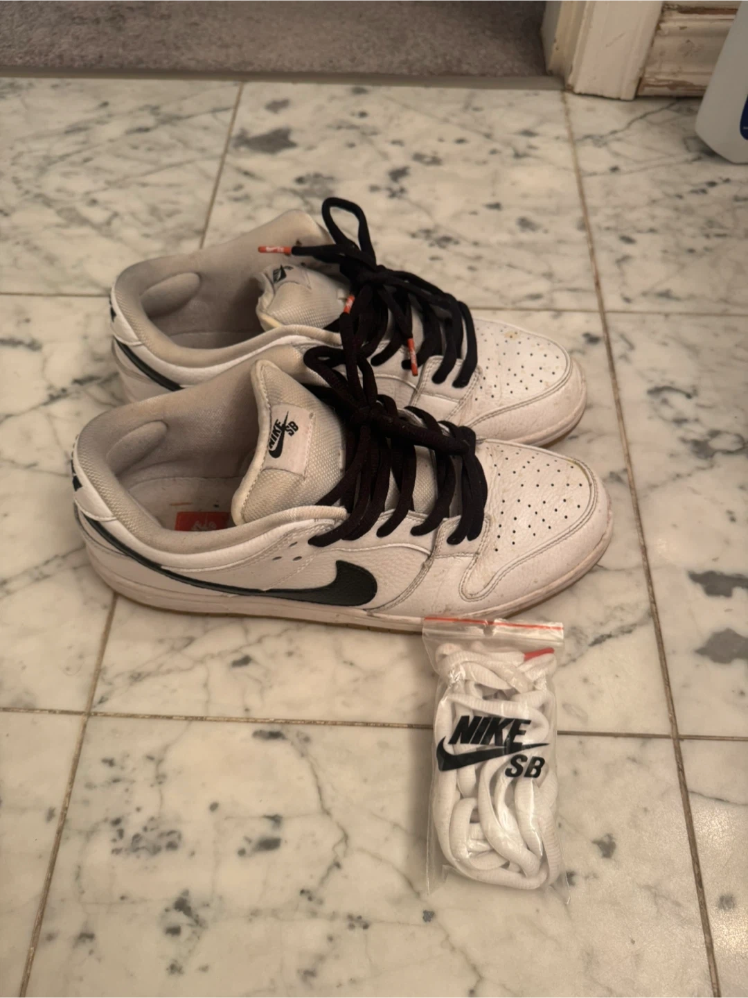 White Nike SB Dunk Low sneakers with black accents. Includes an extra set of white laces in the original Nike SB packaging. These are classic skateboarding shoes.
