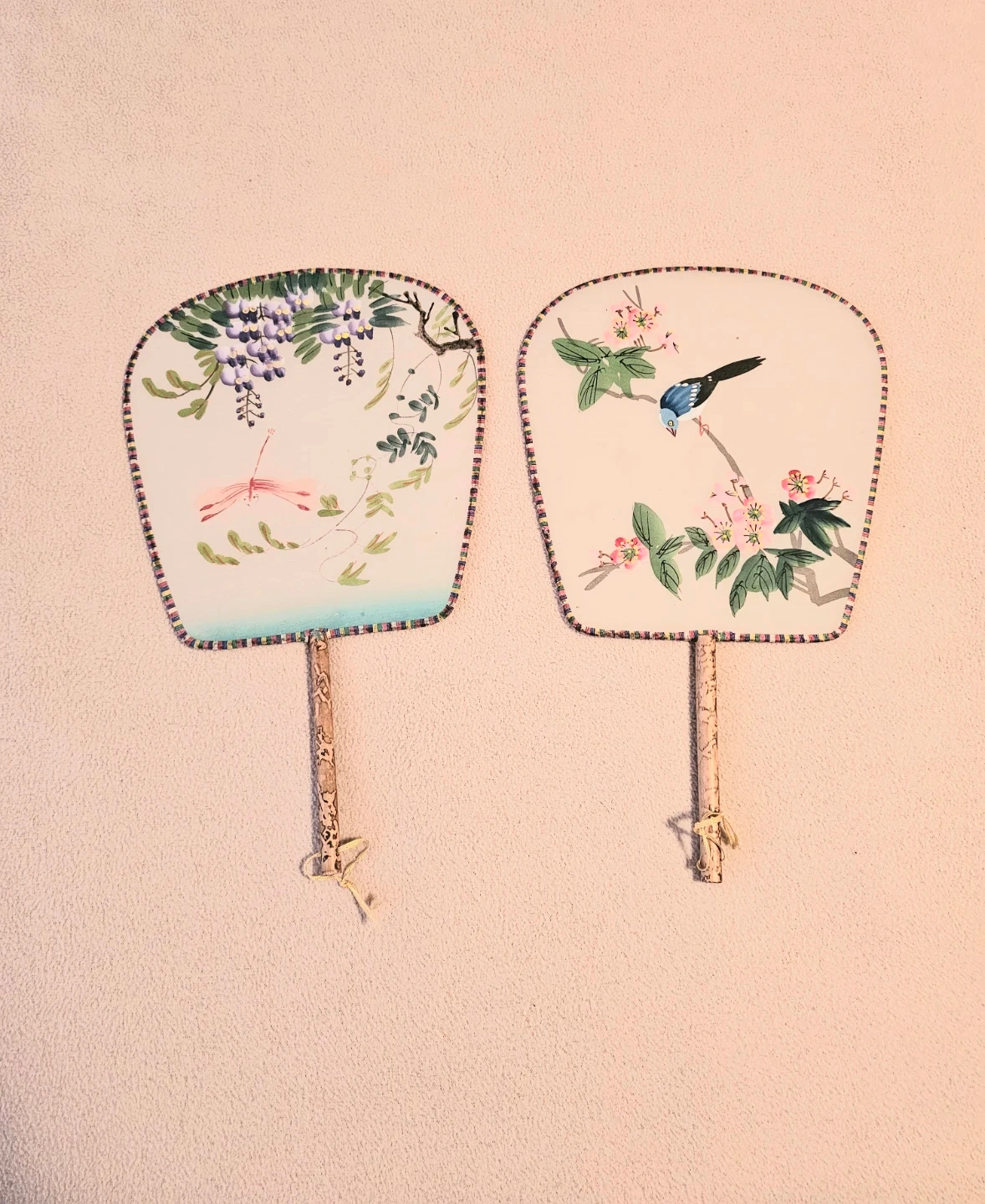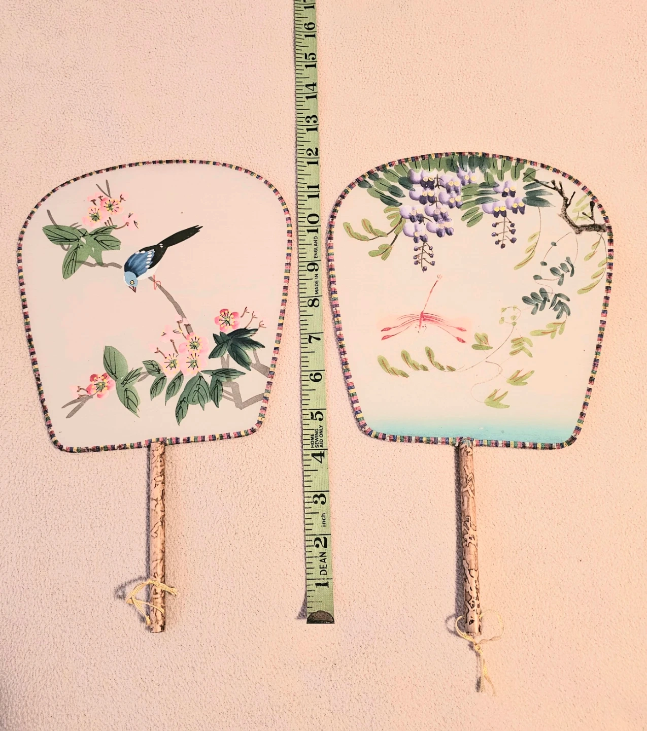 Beautiful vintage hand-painted silk fans. One fan depicts a bird perched on a flowering branch, while the other features a dragonfly among wisteria. They're decorative pieces with wooden handles. $4 Each