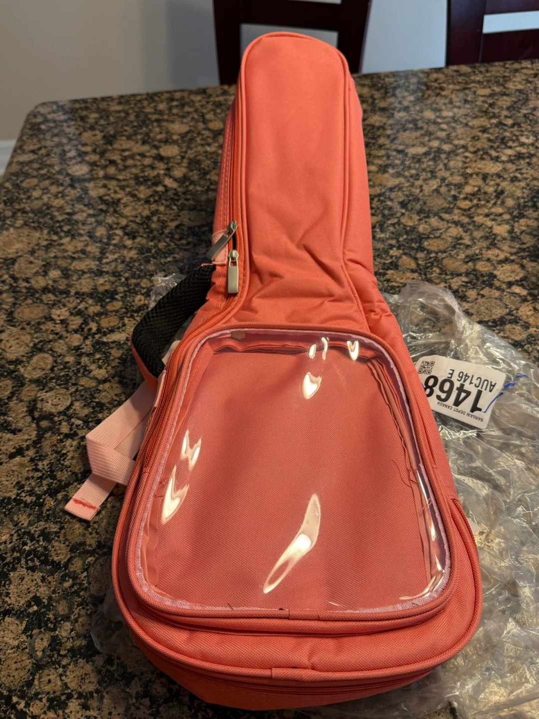 Selling a coral pink ukulele gig bag! It's perfect for carrying your ukulele safely and in style. The bag features a clear pocket on the front, and a convenient handle and straps for easy transport. Great for musicians on the go