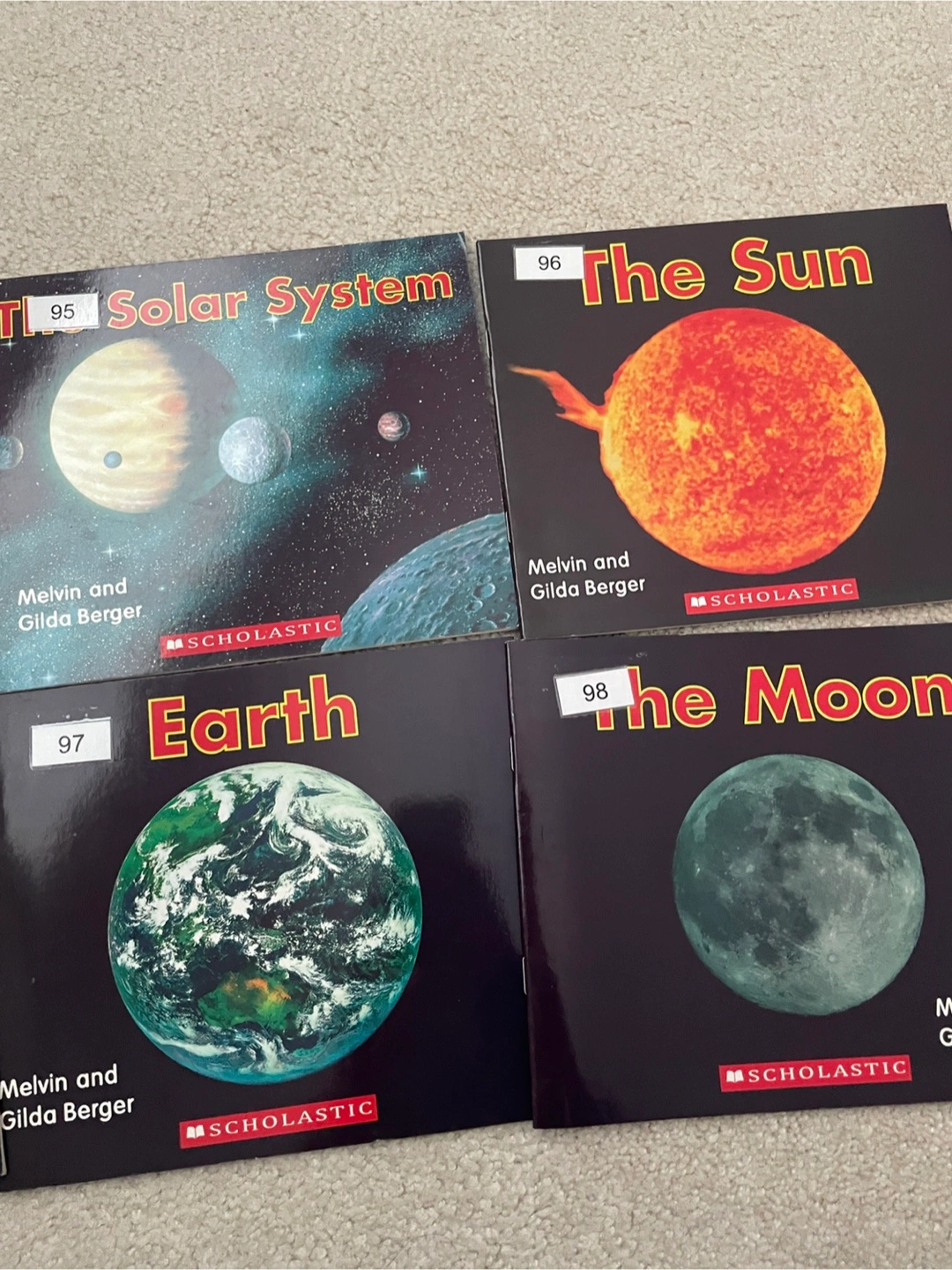 Selling a set of Scholastic books about space, written by Melvin and Gilda Berger! The titles include: