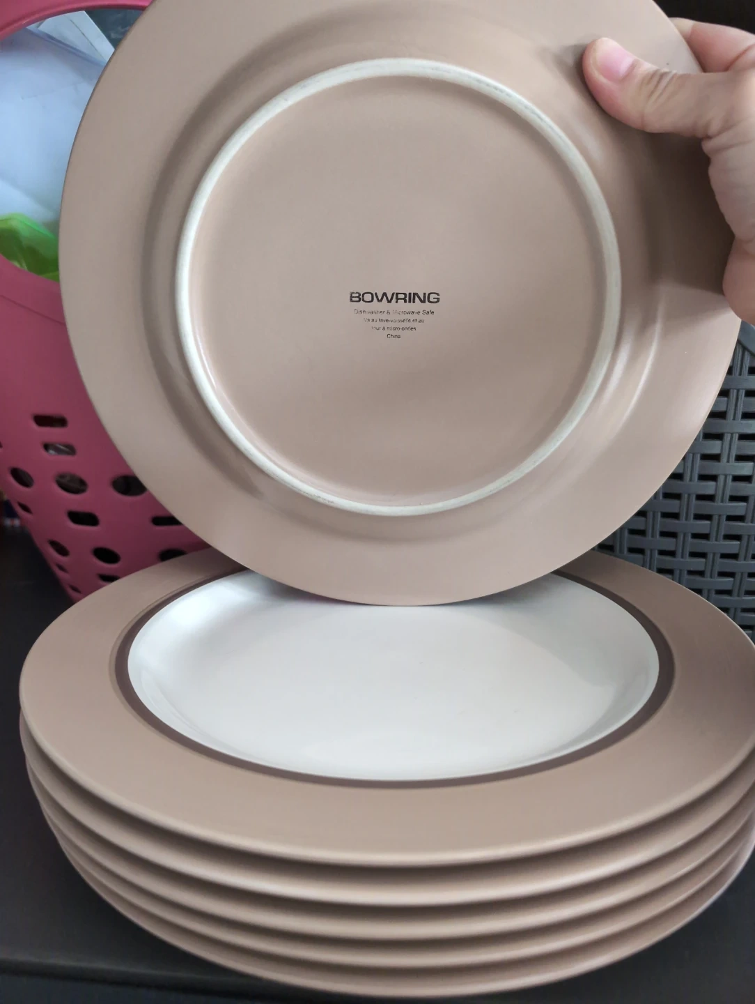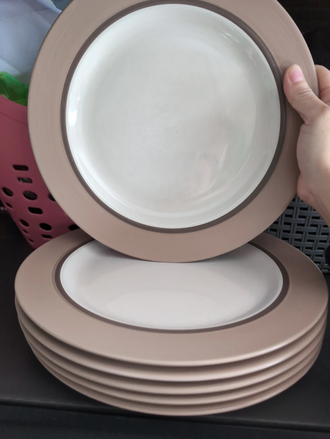 Selling a set of 6 Bowring dinner plates. They're in great shape and ready for a new home. The plates have a lovely neutral colour with a brown trim.