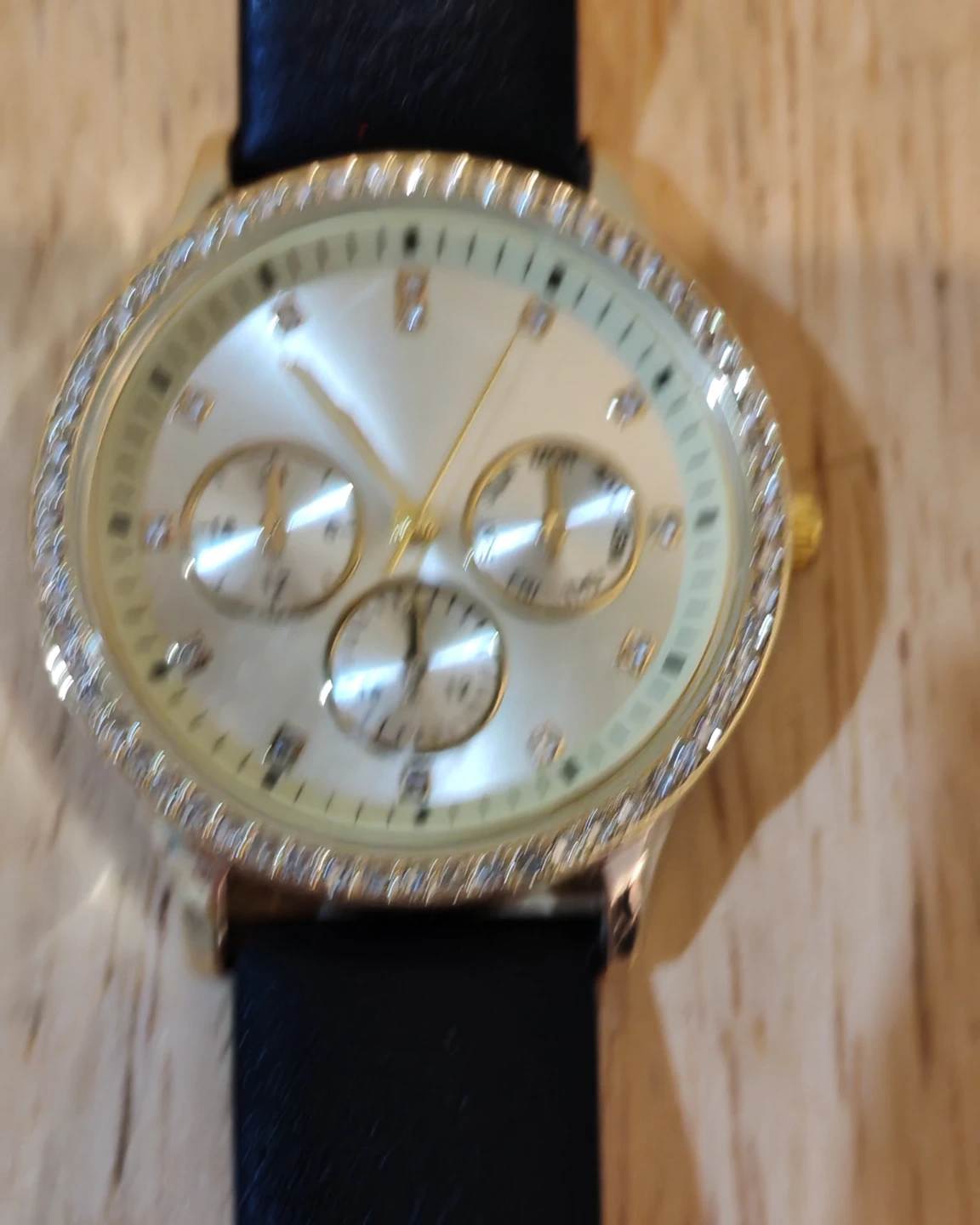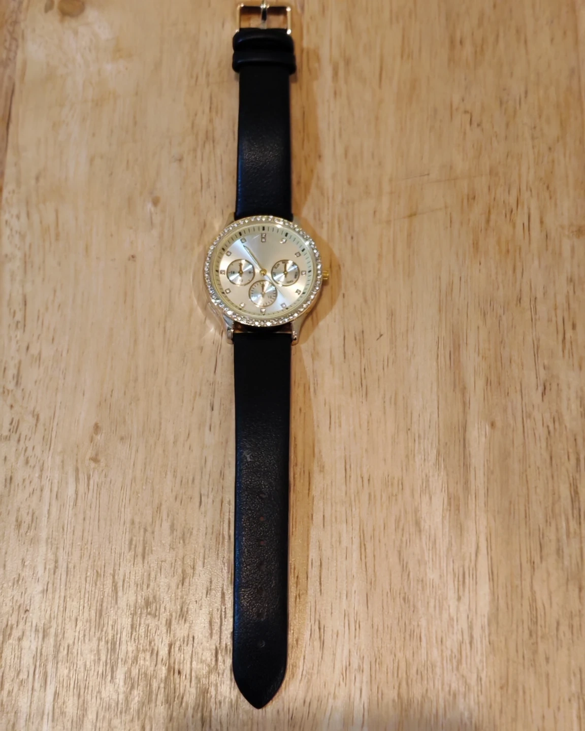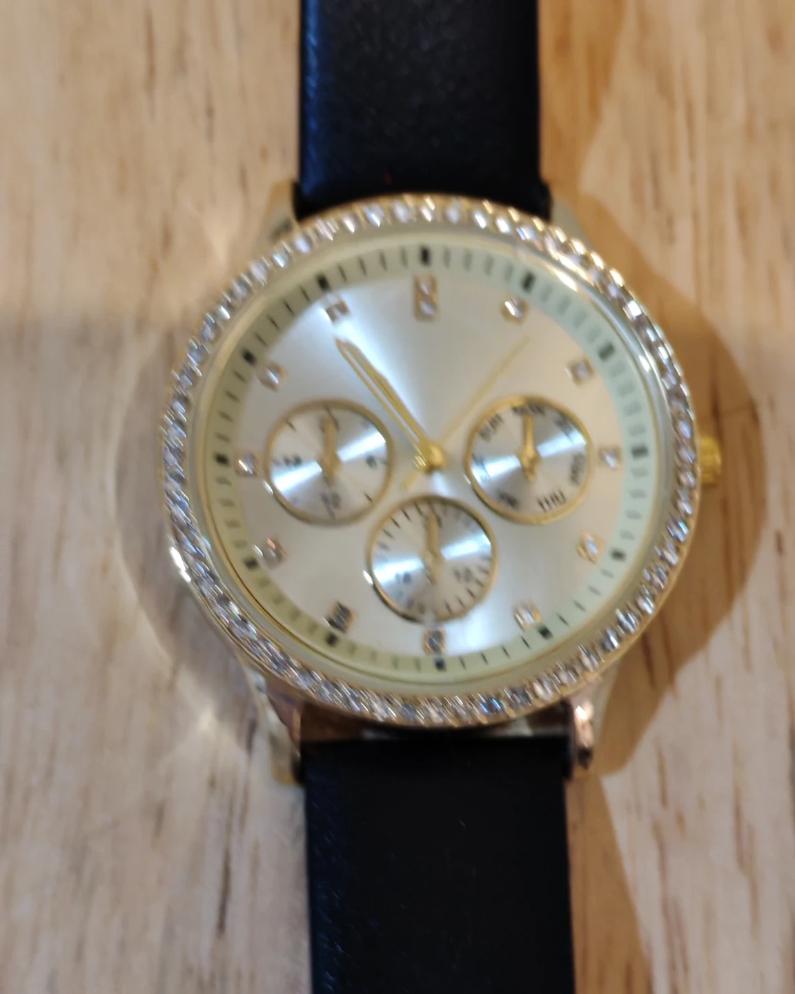 Selling a ladies' watch with a gold-tone case and a black strap. The watch face has a decorative design with multiple subdials and a crystal-studded bezel. It's in great condition!