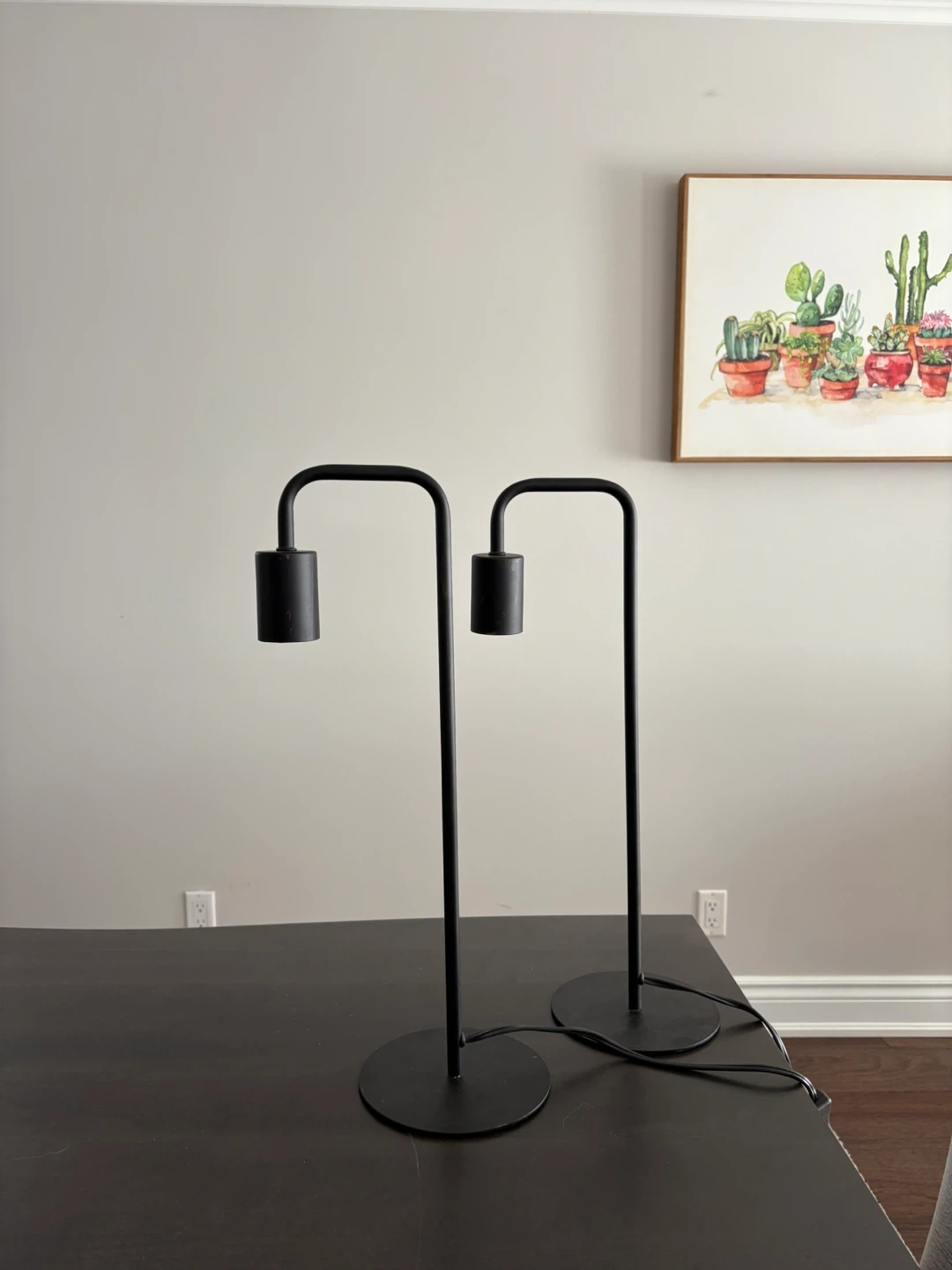 Selling a pair of modern table lamps in black. They are in great shape and would look great in any room. Each lamp is about 48cm tall.