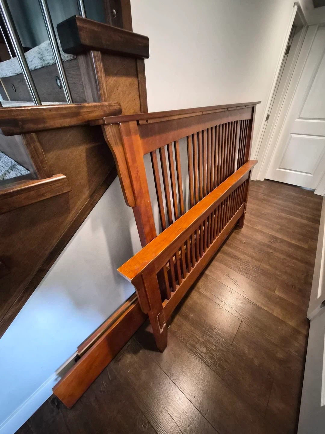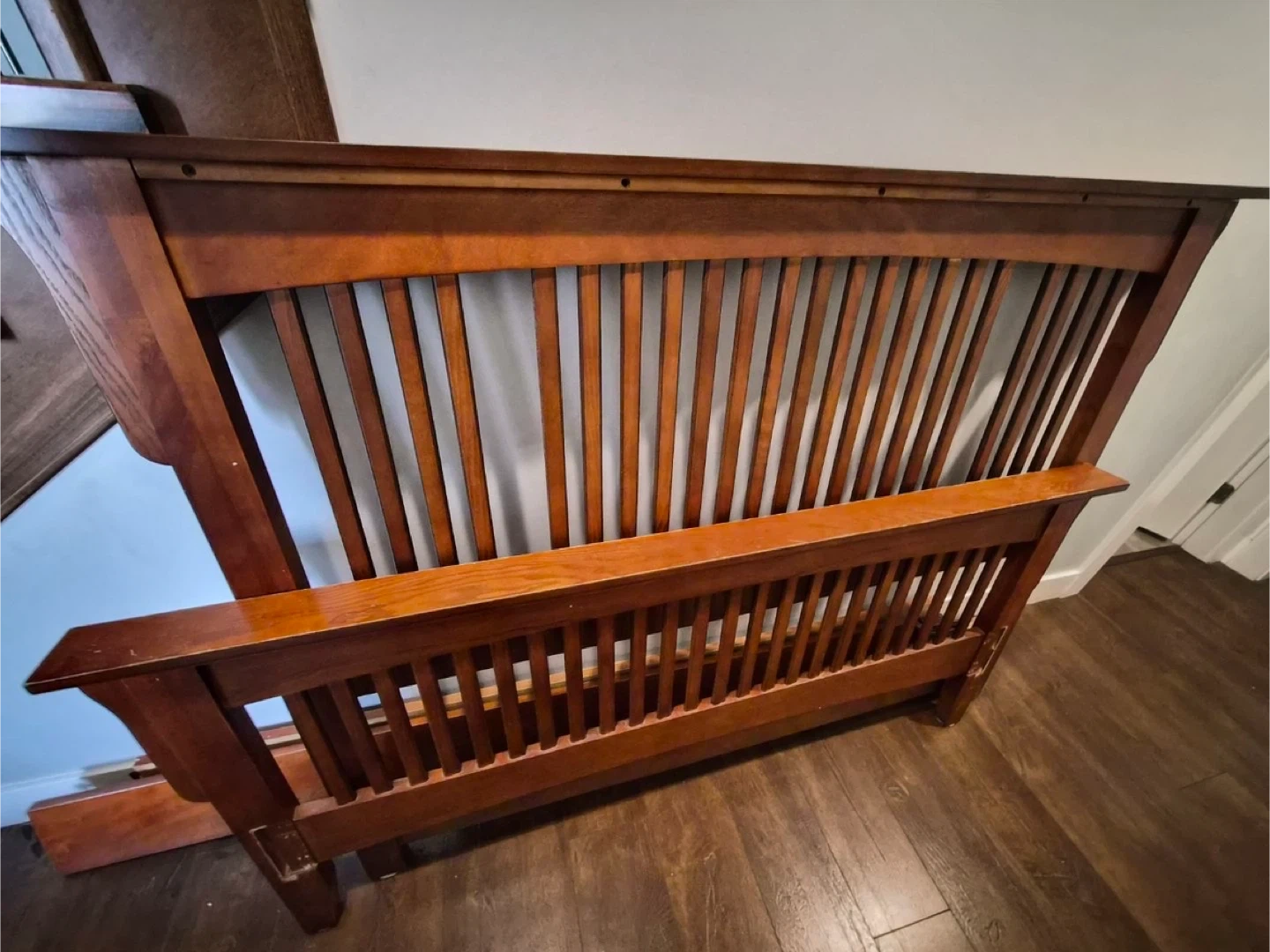 I'm giving away a wooden bed frame. It's a lovely piece that would look great in any bedroom! The wood has a beautiful grain and warm colour.