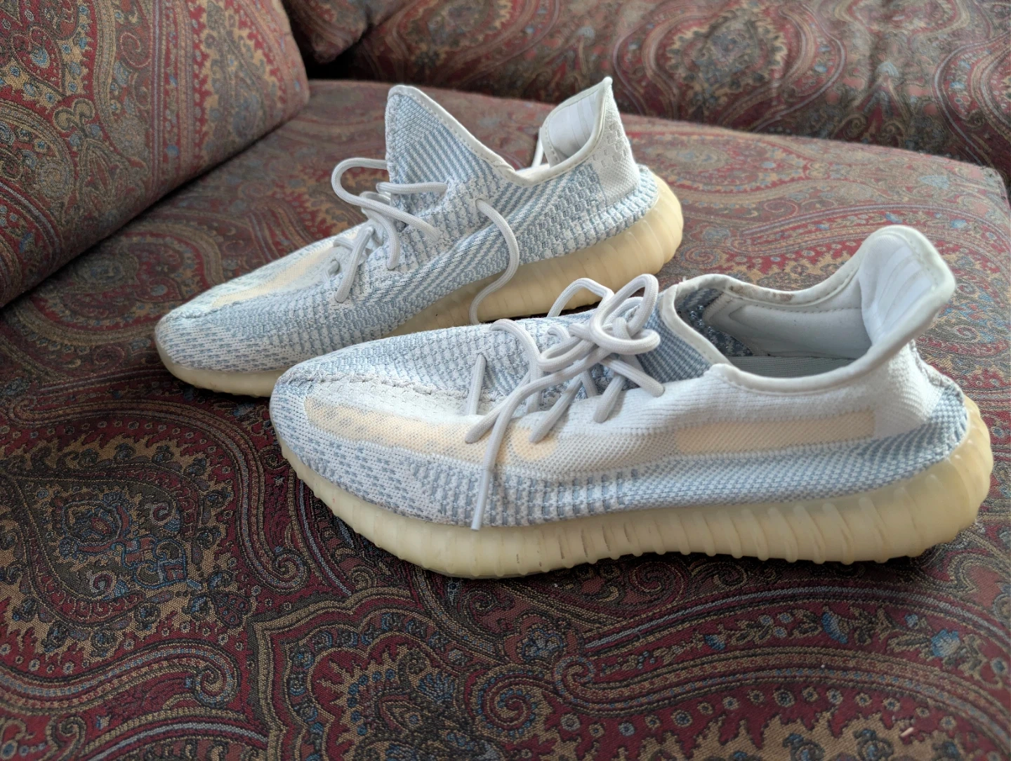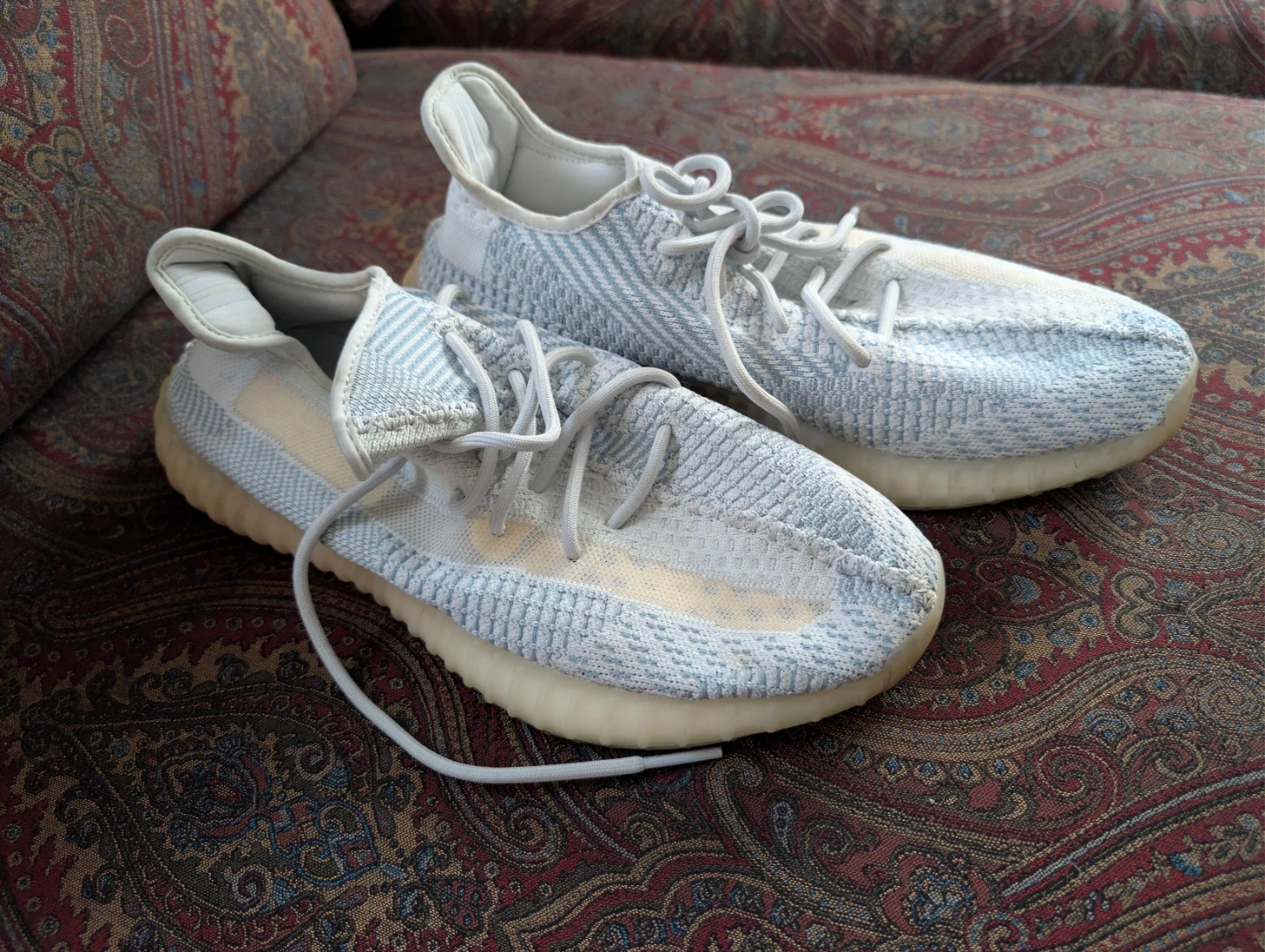 Selling a pair of Adidas Yeezy Boost 350 V2 in the Blue Tint colorway. They are a US size 12. Please take a close look at the photos to assess the condition!