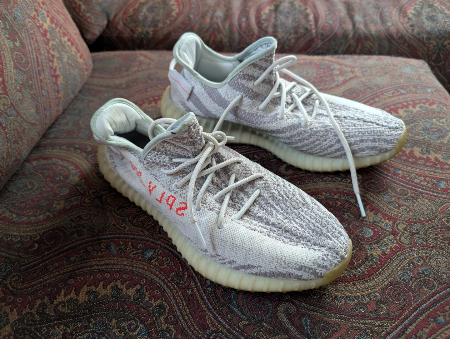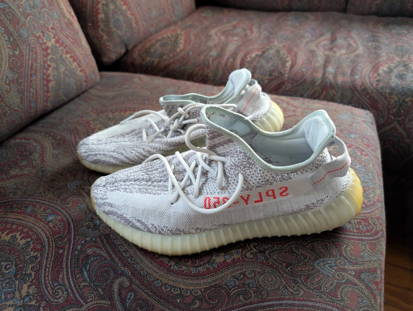 Selling a pair of Adidas Yeezy Boost 350 V2 in the Blue Tint colorway. These are a US size 11 1/2. They were made in China in 2017 August 08.