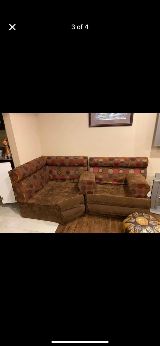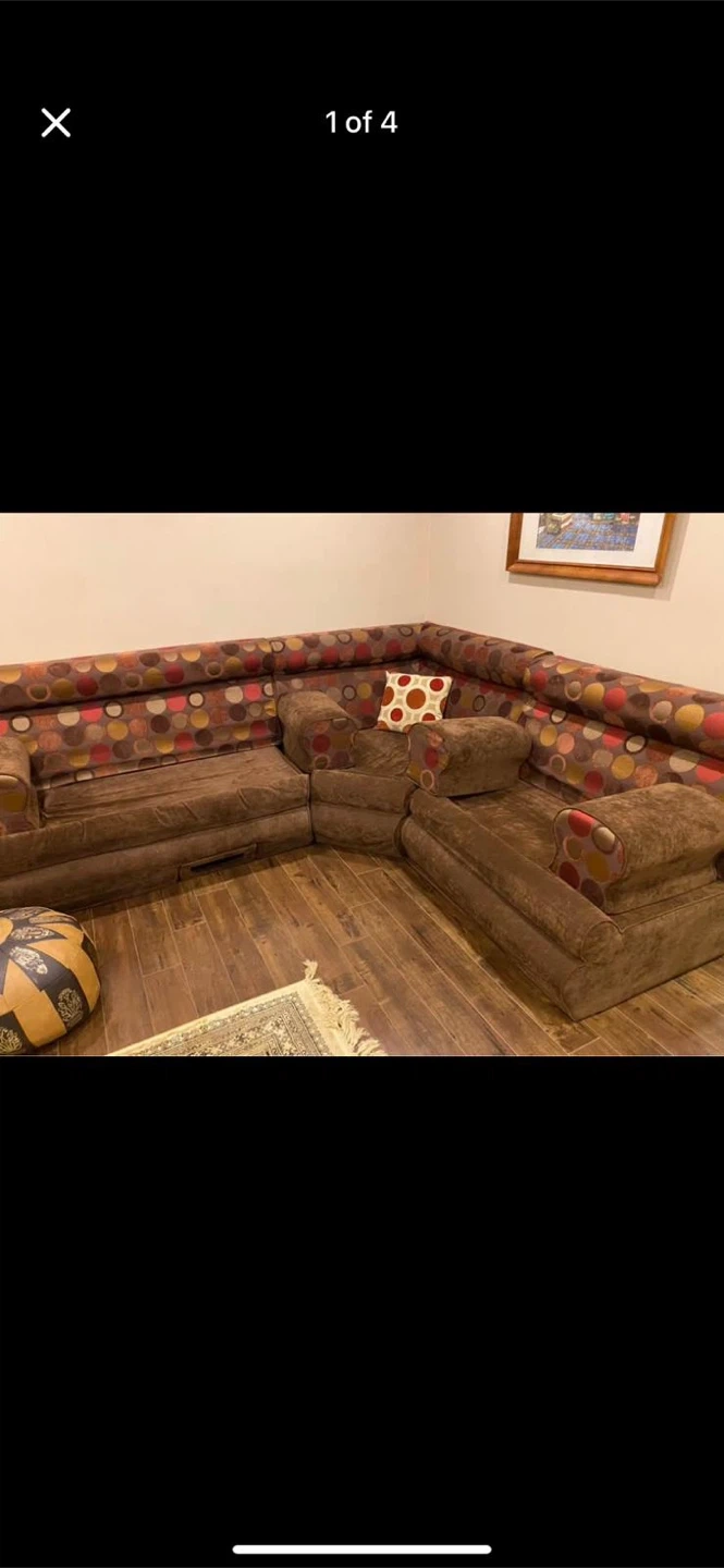 Selling a comfortable brown arab style sofa. It features a unique polka dot pattern on the upper portion. It's perfect for a living room or entertainment area!