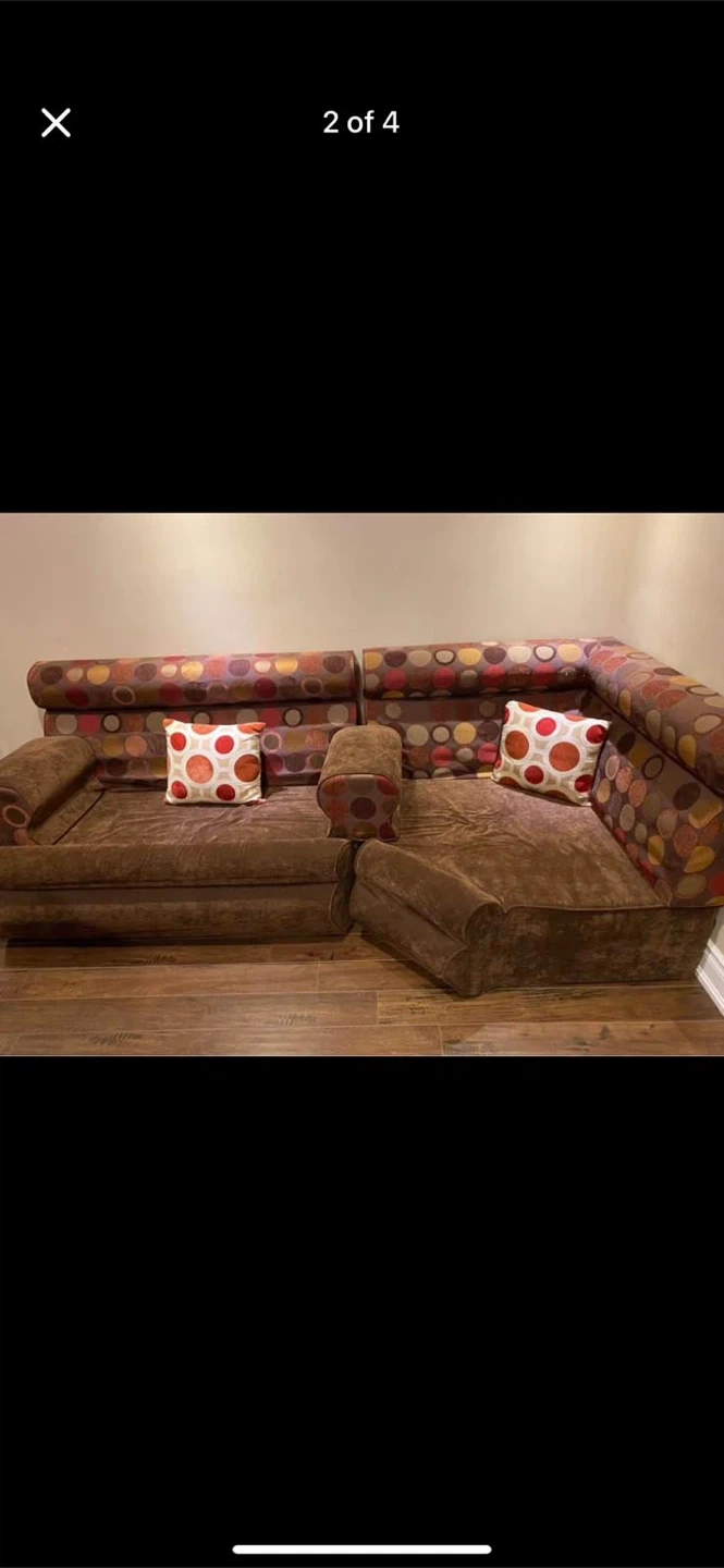 Selling a comfortable brown arab style sofa. It features a unique polka dot pattern on the upper portion. It's perfect for a living room or entertainment area!