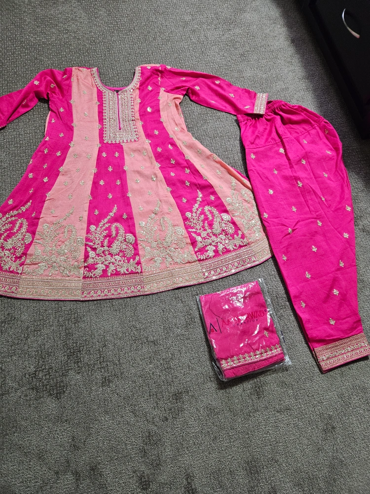 Beautiful pink salwar kameez suit with intricate embroidery. Perfect for special occasions! The suit includes a tunic, pants, and a dupatta. The material feels soft and comfortable. It's in great condition and ready to wear