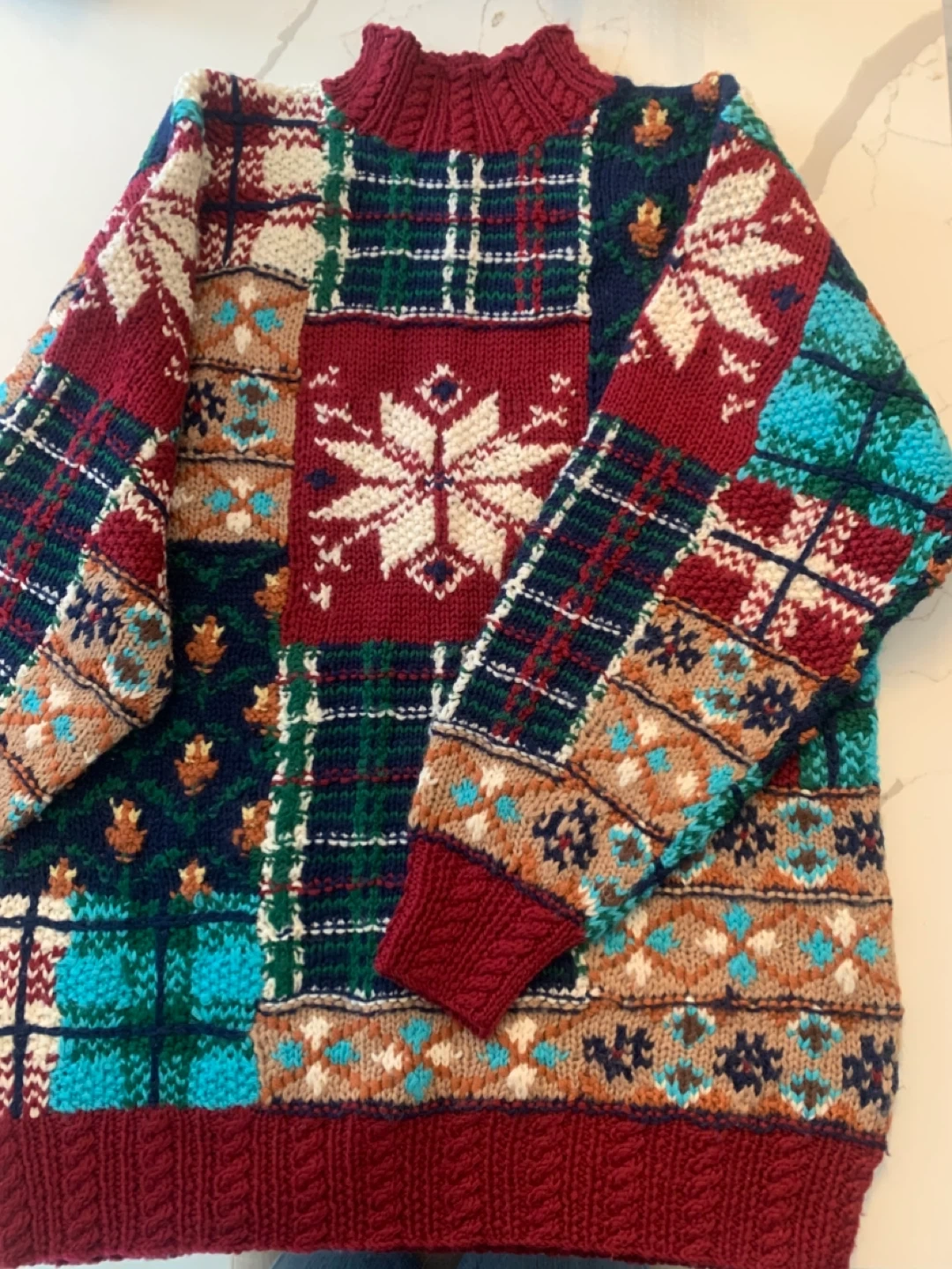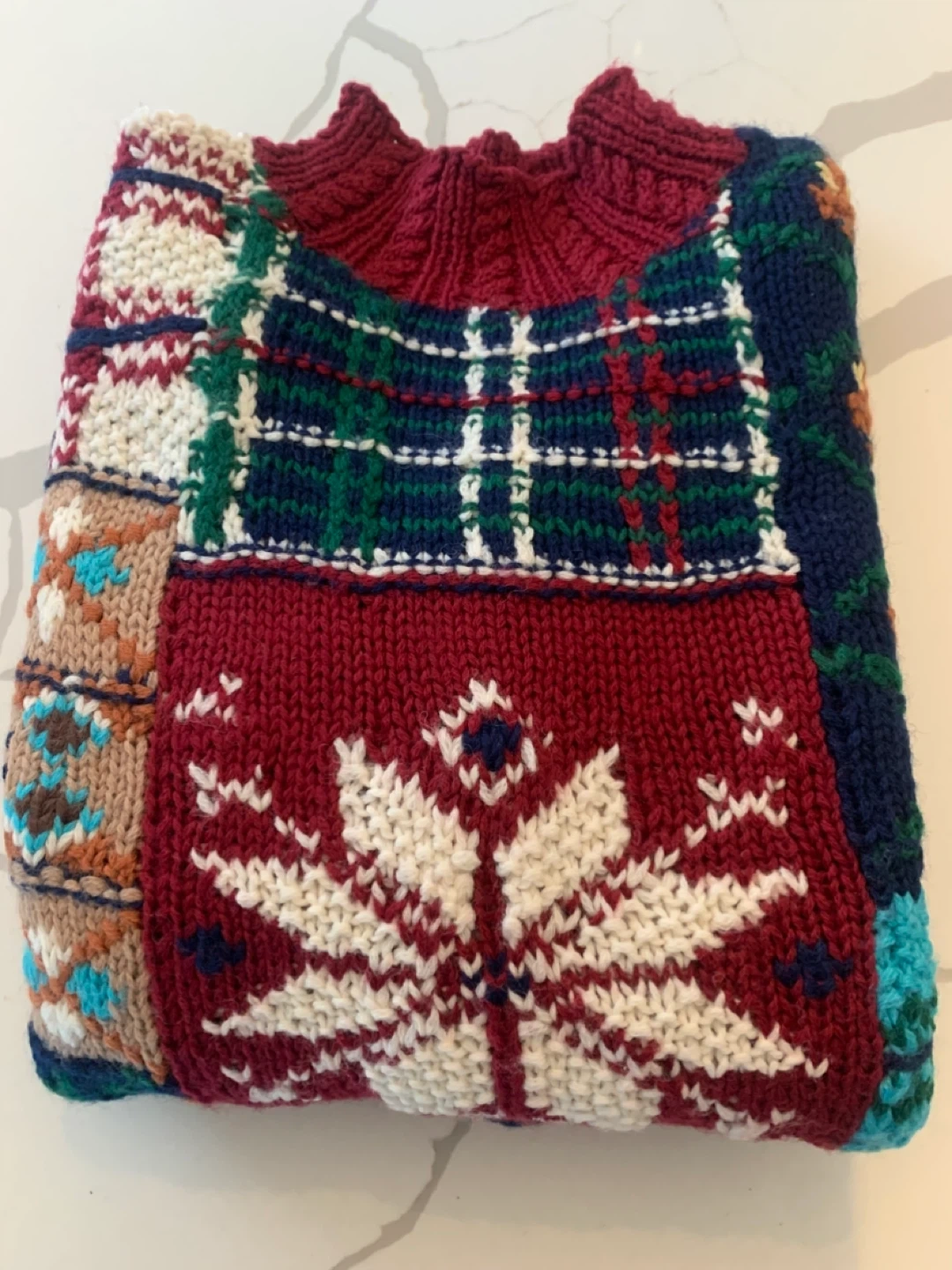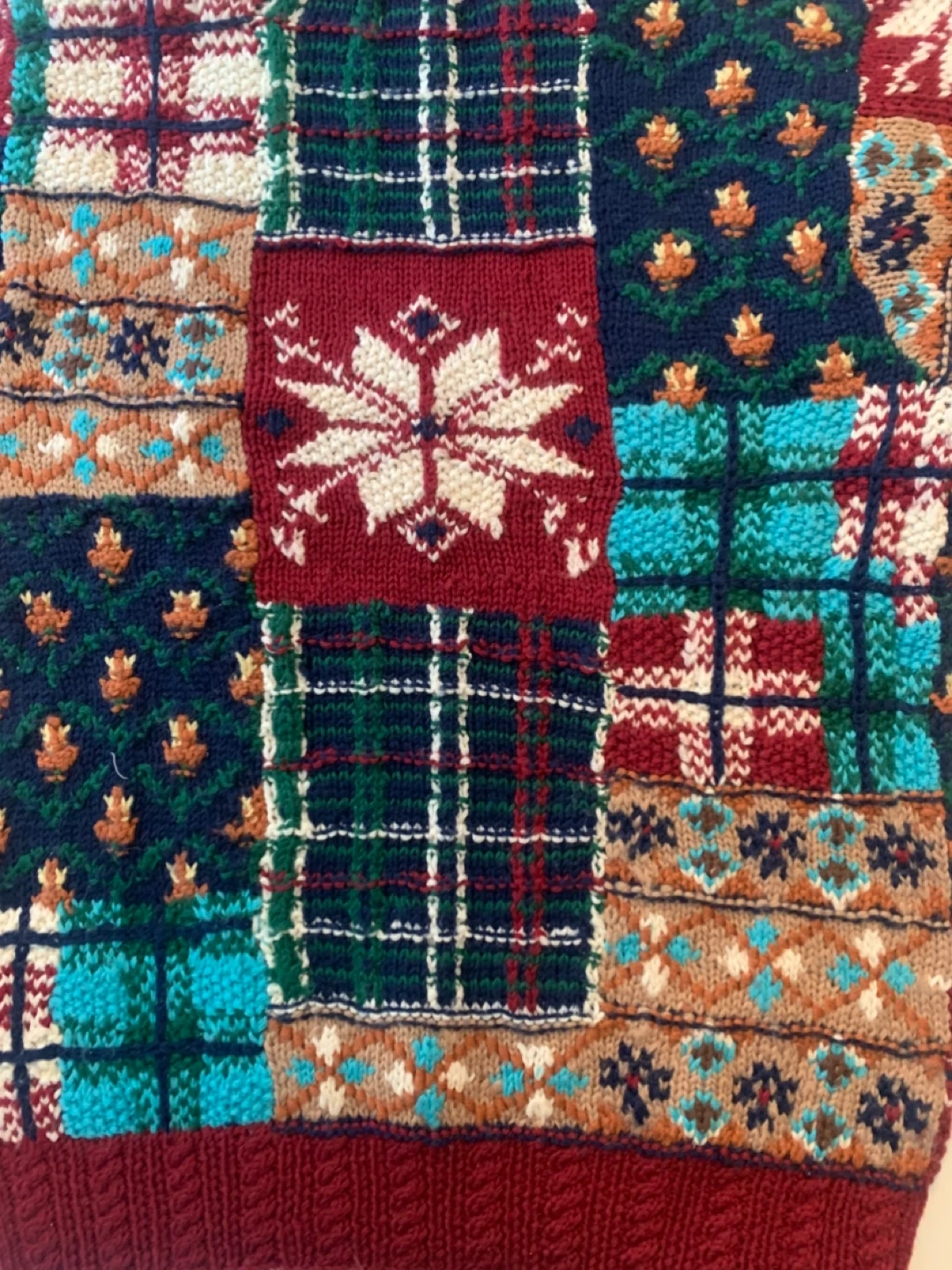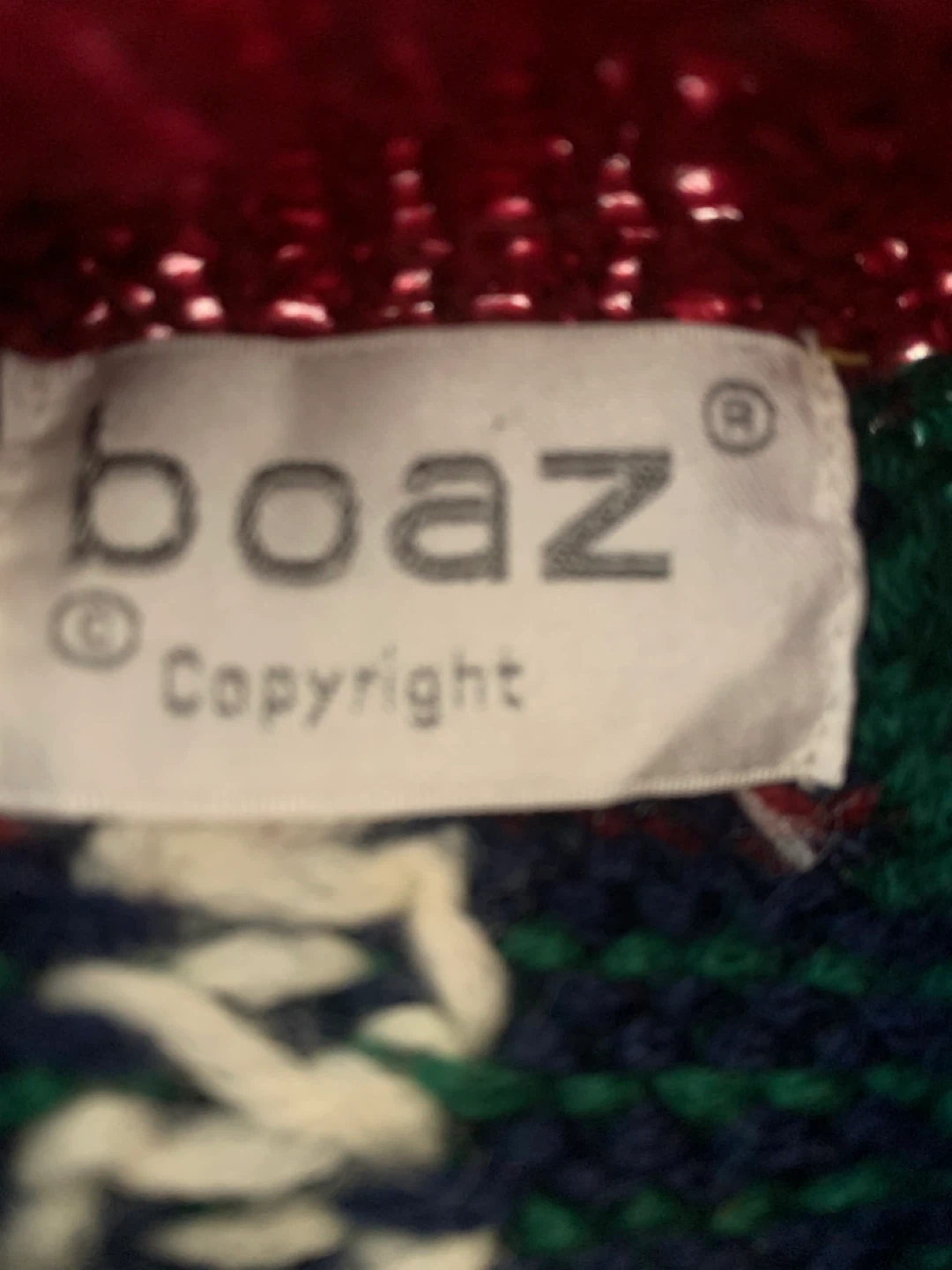 Here’s a colourful Boaz knit sweater! It features a unique patchwork design with various patterns and colours. Perfect for adding a fun, cozy touch to your wardrobe!