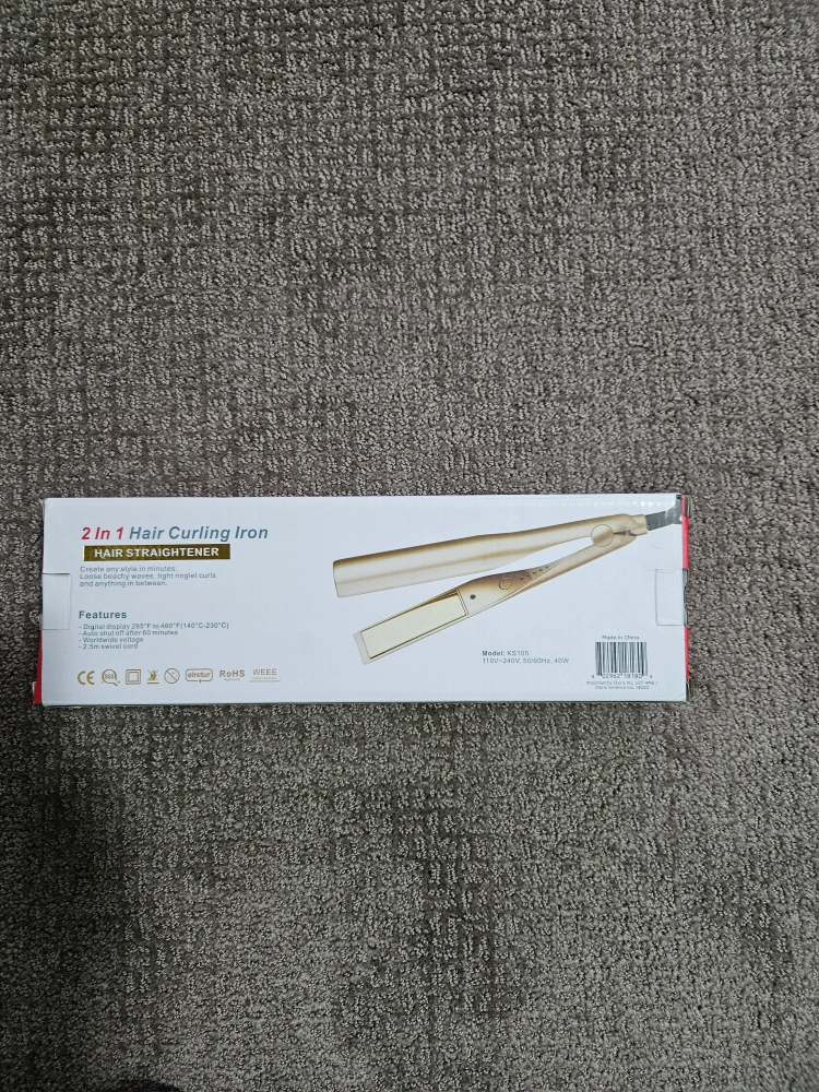 Selling a 2 in 1 hair curling iron and hair straightener! It can create loose beachy waves, tight ringlet curls, and anything in between. It also features a digital display from 285°F to 460°F (140°C-230°C). Model number is KS105, 110V-240V, 50/60Hz, 40W