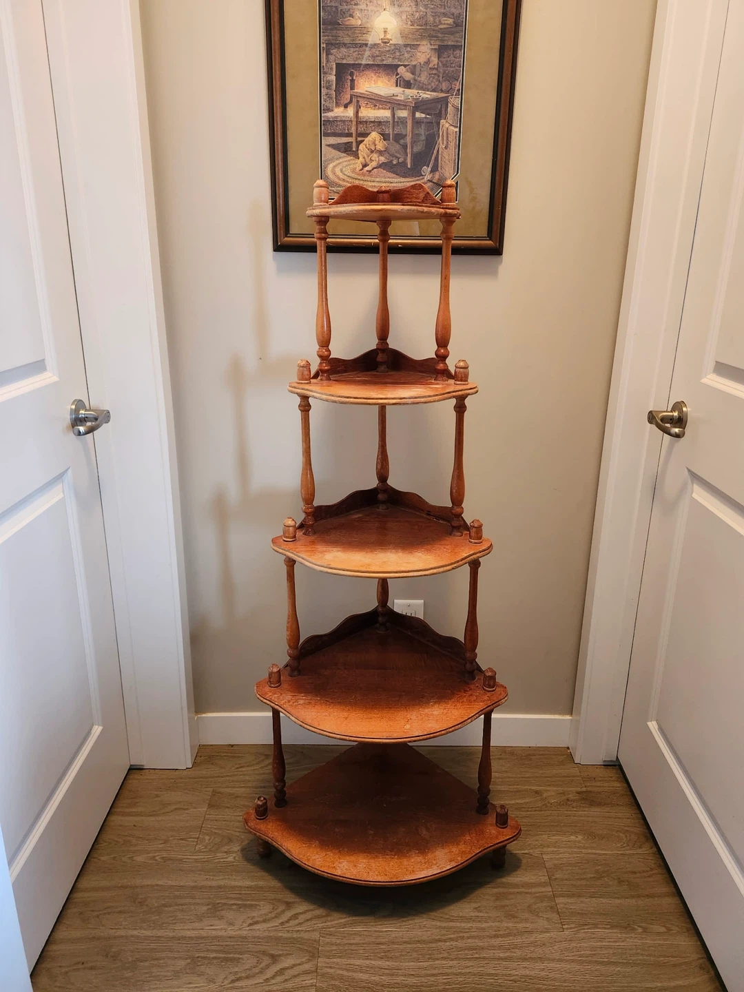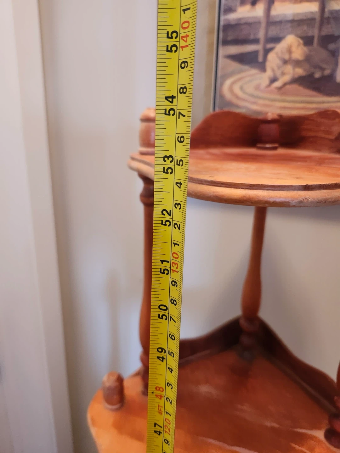 Here's a lovely wooden corner shelf that stands about 53 inches tall. It's perfect for displaying plants, books, or other decorative items. It's in good condition and ready to add some charm to your space!