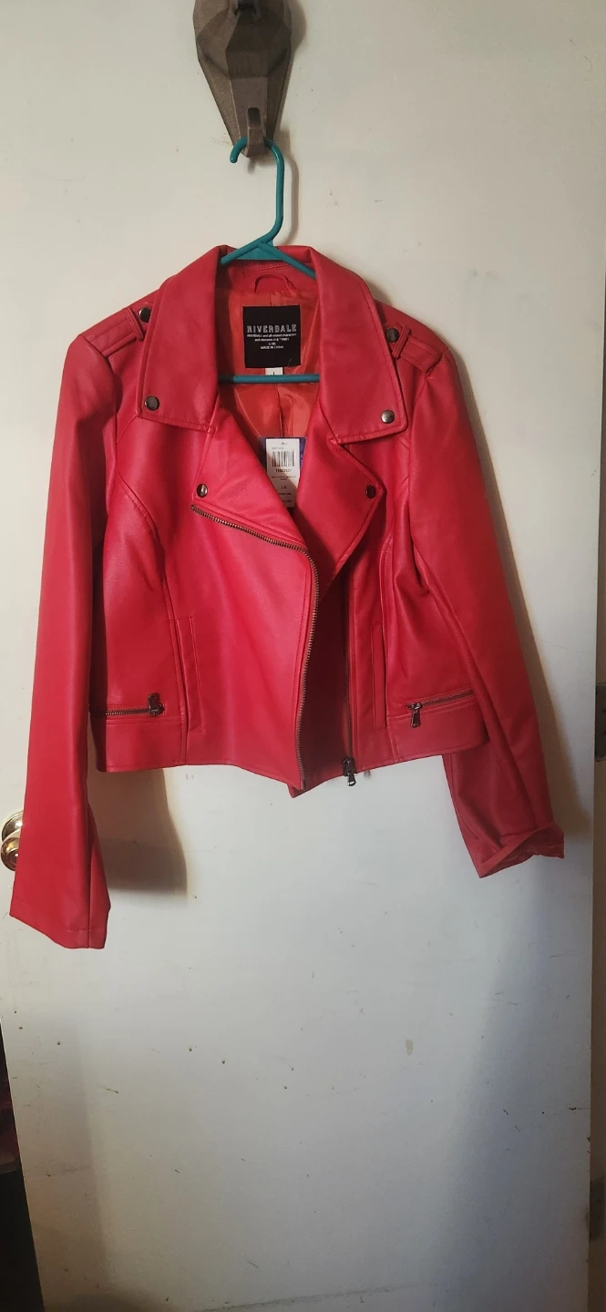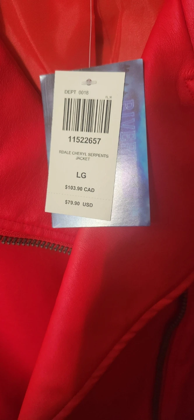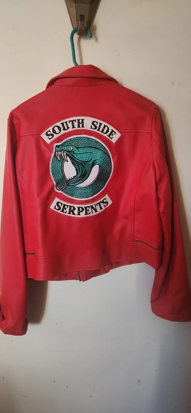Selling a Riverdale Cheryl Serpents jacket in size large! It's a vibrant red colour and made with a shell of 100% PU and lining of 100% polyester. Originally bought for $103.90 CAD. It features the South Side Serpents logo on the back.