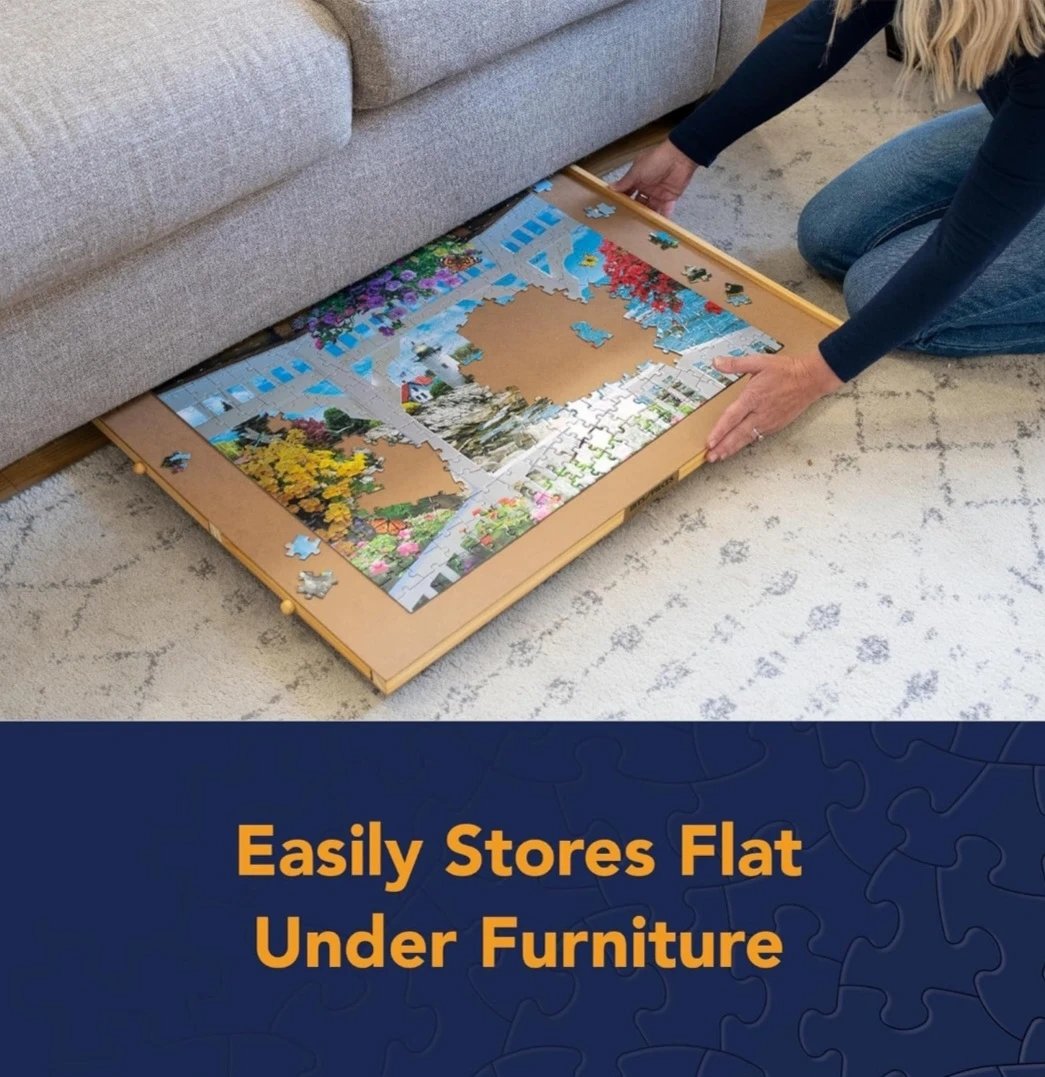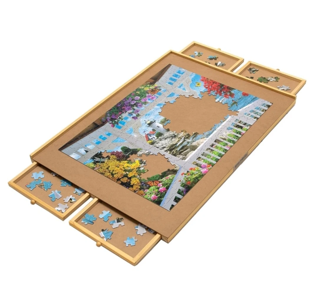 Wooden jigsaw board will keep all your pieces organized with 4 sliding drawers. Easy to store away under a bed or couch. Meant for 1000 pcs or less. Retails for $70 new. It is in used good condition.