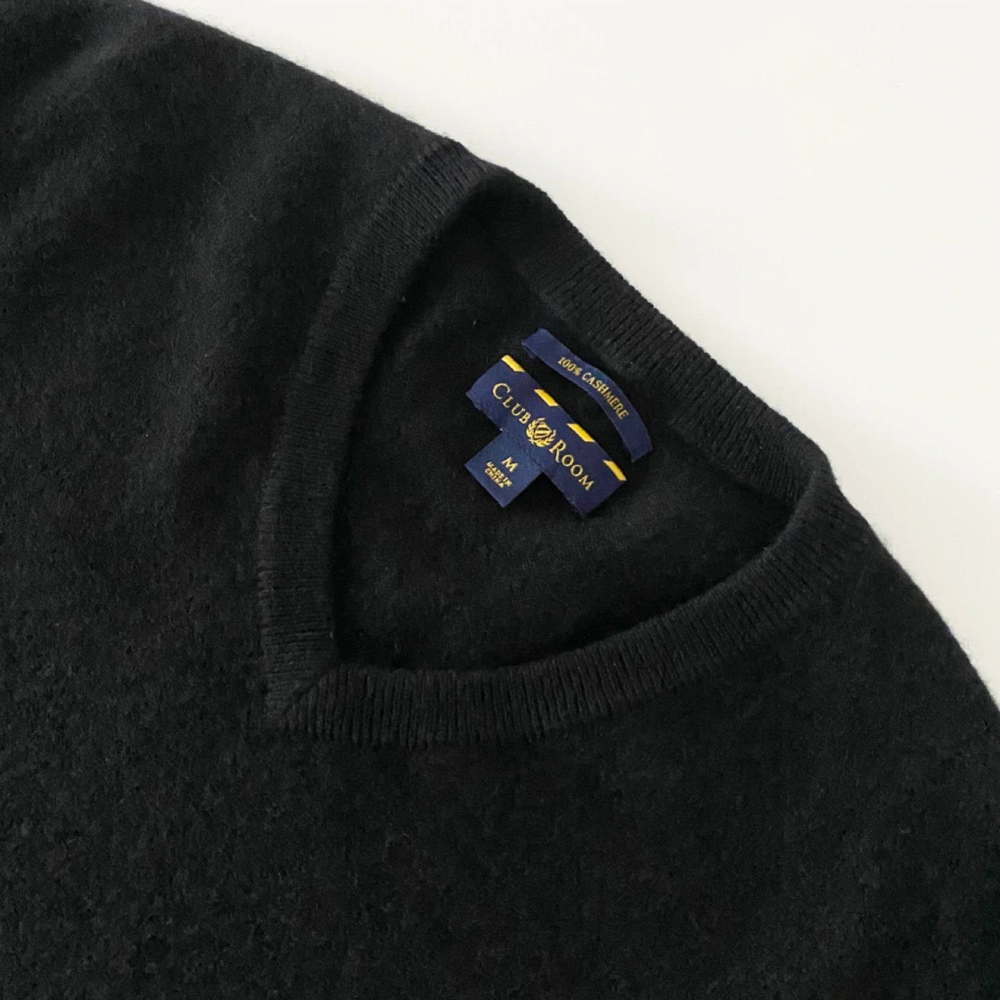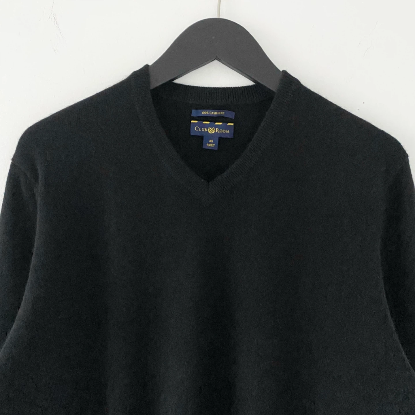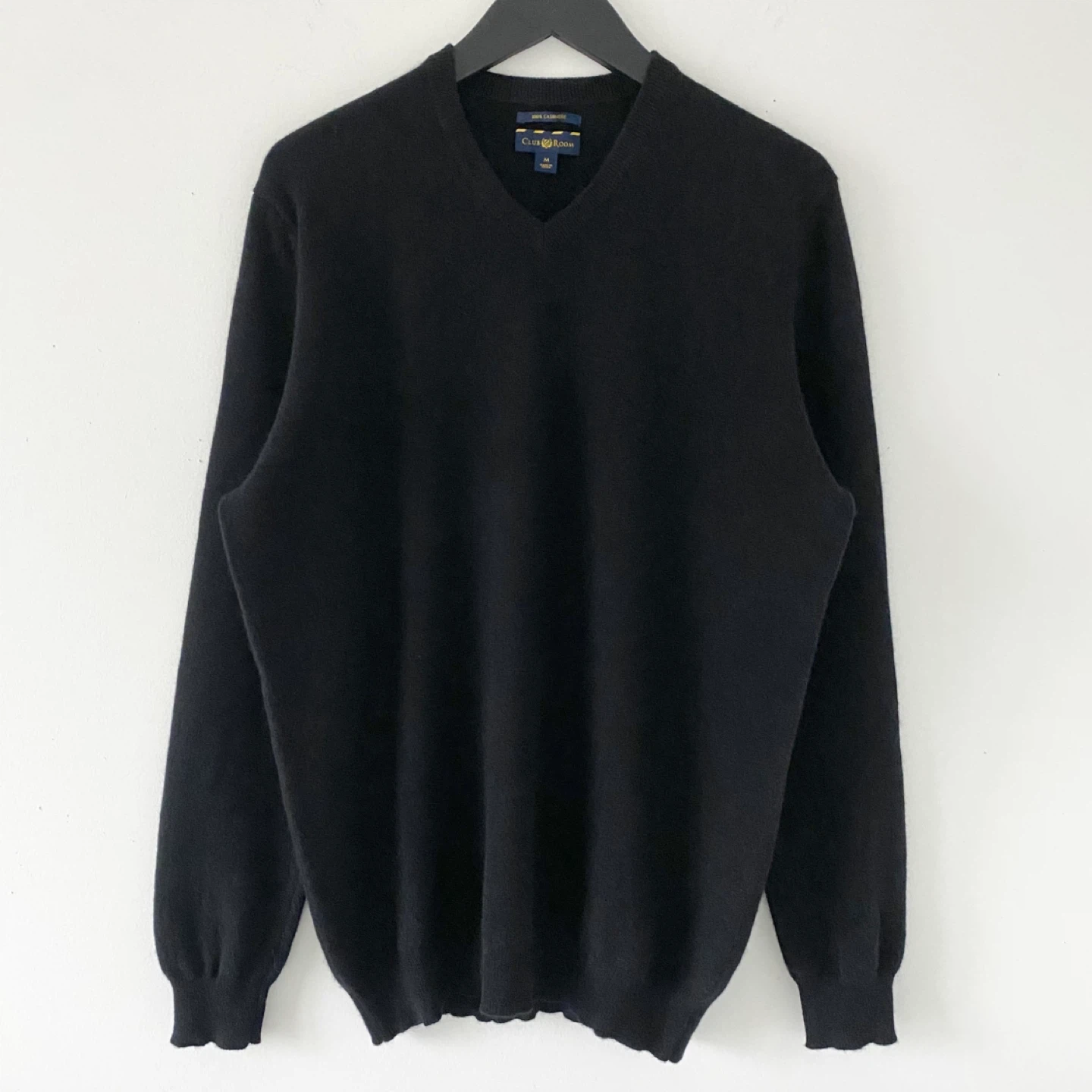 Club Room classic v-neck sweater. Made of lightweight 100% cashmere in rich black. It's soft, cozy and luxe. I don't find it itchy but it's subjective. There's no staining, pilling or damage. It's clean and in excellent condition.