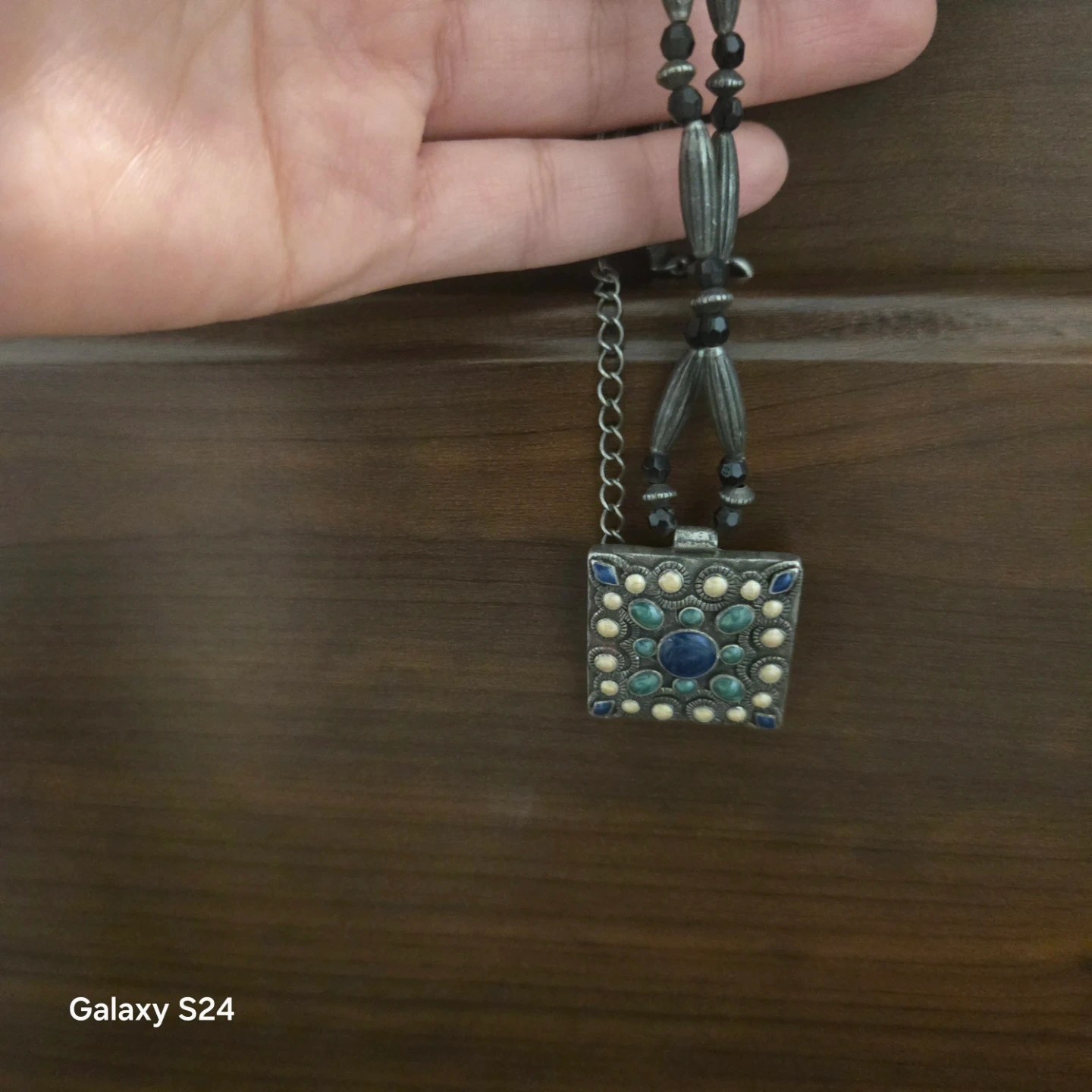 Selling a beautiful pendant necklace with a square pendant. It features blue, green, and cream coloured stones or beads in a circular pattern around a blue centre stone. The necklace is beaded with black and silver beads. Adjustable size