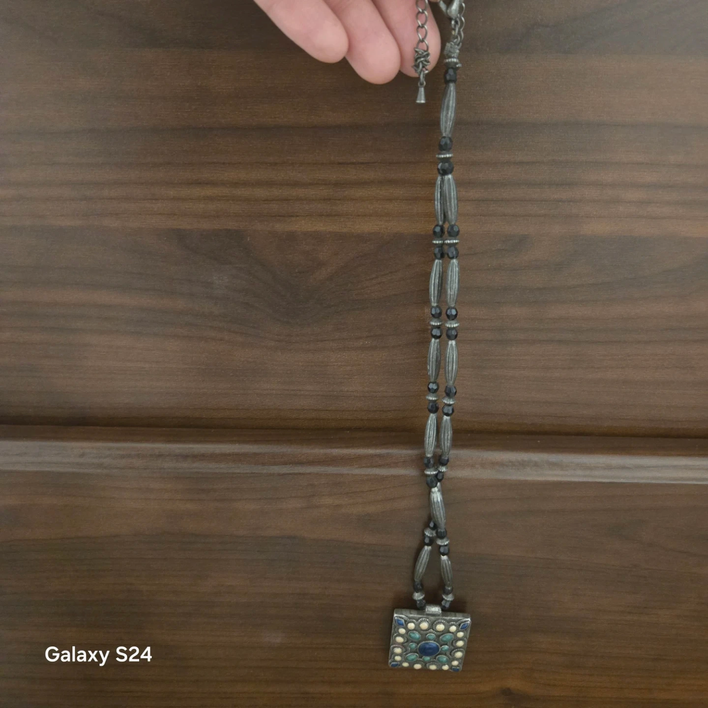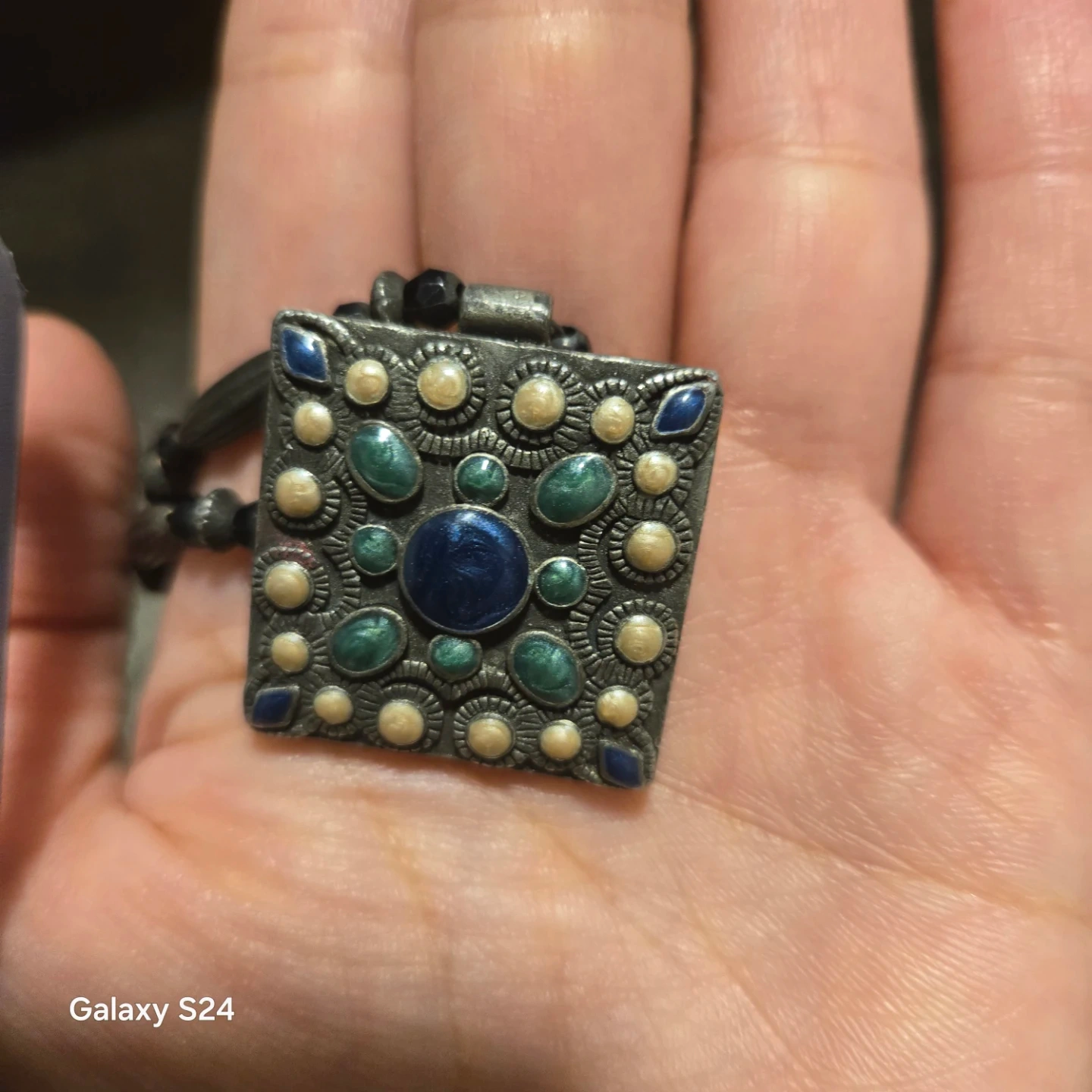 Selling a beautiful pendant necklace with a square pendant. It features blue, green, and cream coloured stones or beads in a circular pattern around a blue centre stone. The necklace is beaded with black and silver beads. Adjustable size