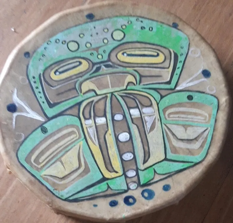 Selling a hand drum with Indigenous artwork. It's in good condition, with a unique design featuring green, yellow, and brown colours. A great piece for anyone interested in Indigenous art and music!