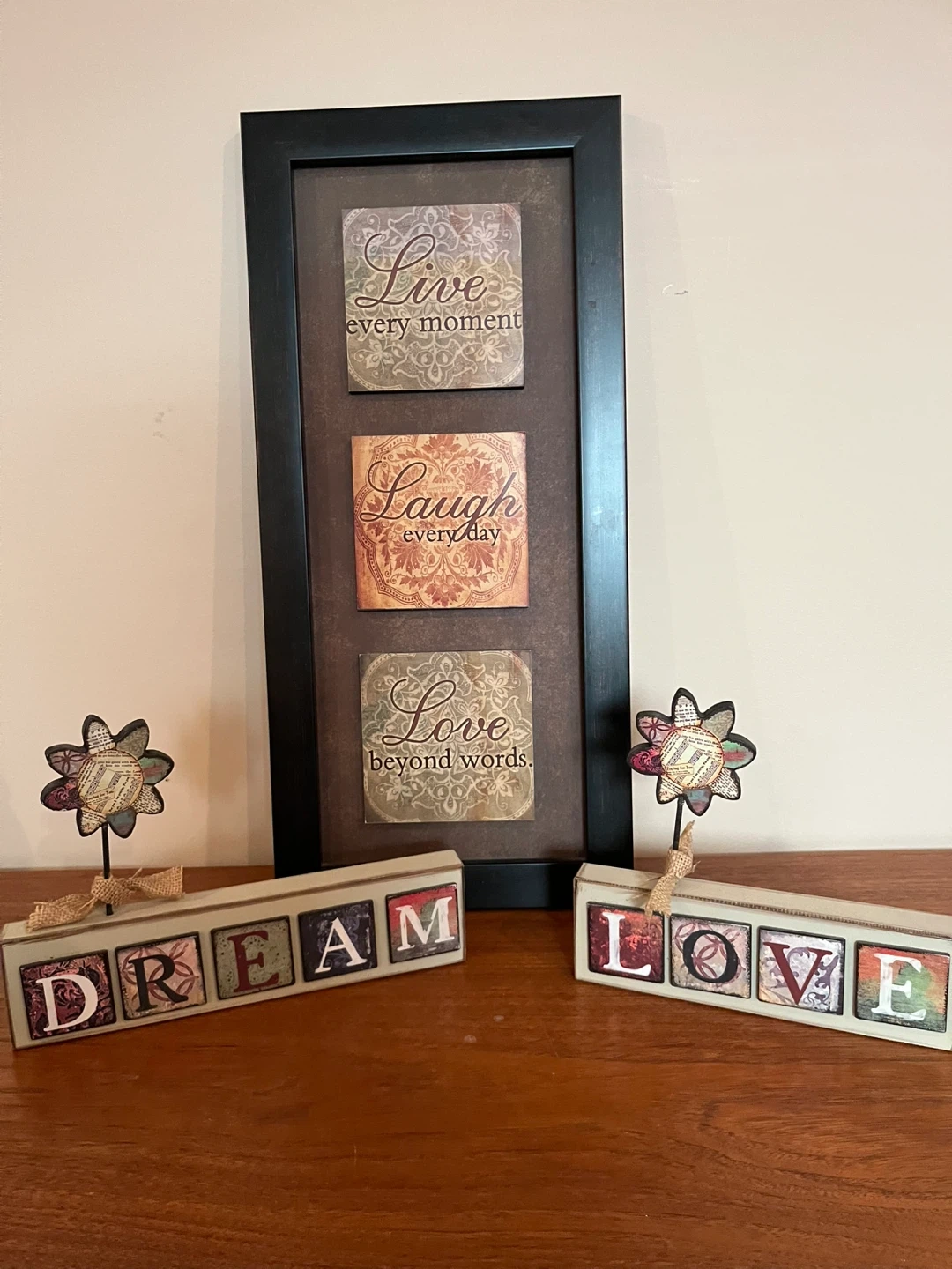 I have a framed piece of wall art featuring the words 'Live every moment,' 'Laugh every day,' and 'Love beyond words' for sale. Also included are two decorative word blocks that spell out 'DREAM' and 'LOVE'. They would look great in any room!