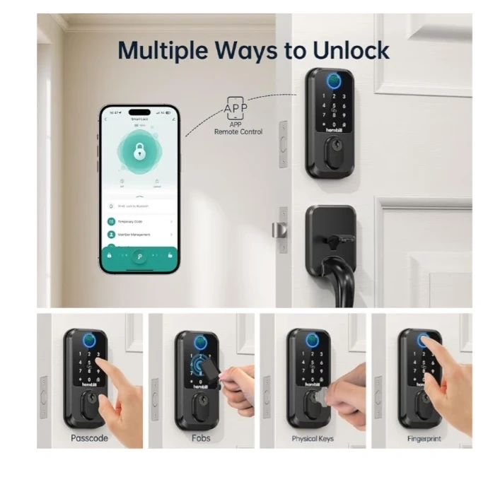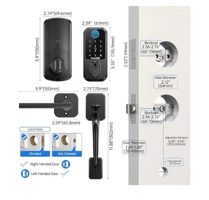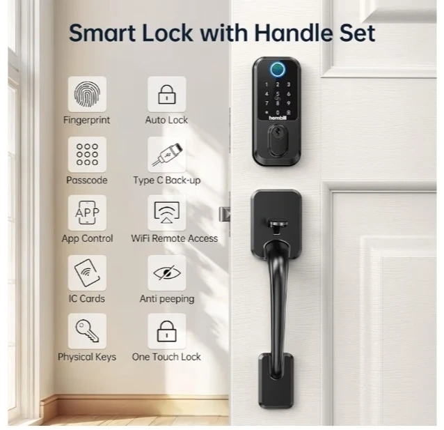 Front Door Lock and Handle Set, Hornbill WiFi Fingerprint Door Lock, Smart Keyless Entry Electronic Keypad Deadbolt for Front Door, Compatible with Alexa, Auto Lock, Matte Black