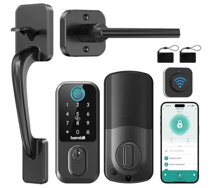 Front Door Lock and Handle Set, Hornbill WiFi Fingerprint Door Lock, Smart Keyless Entry Electronic Keypad Deadbolt for Front Door, Compatible with Alexa, Auto Lock, Matte Black