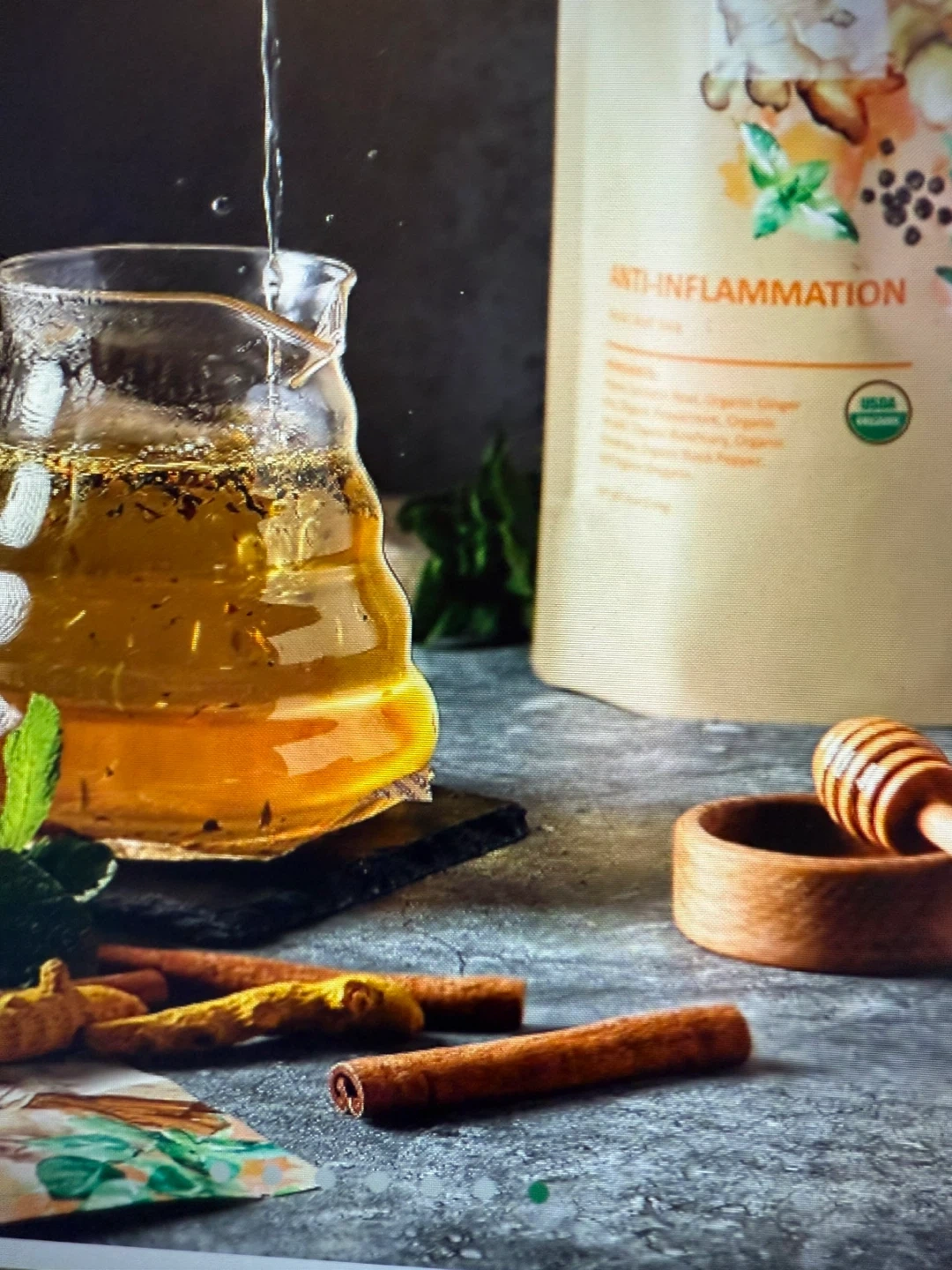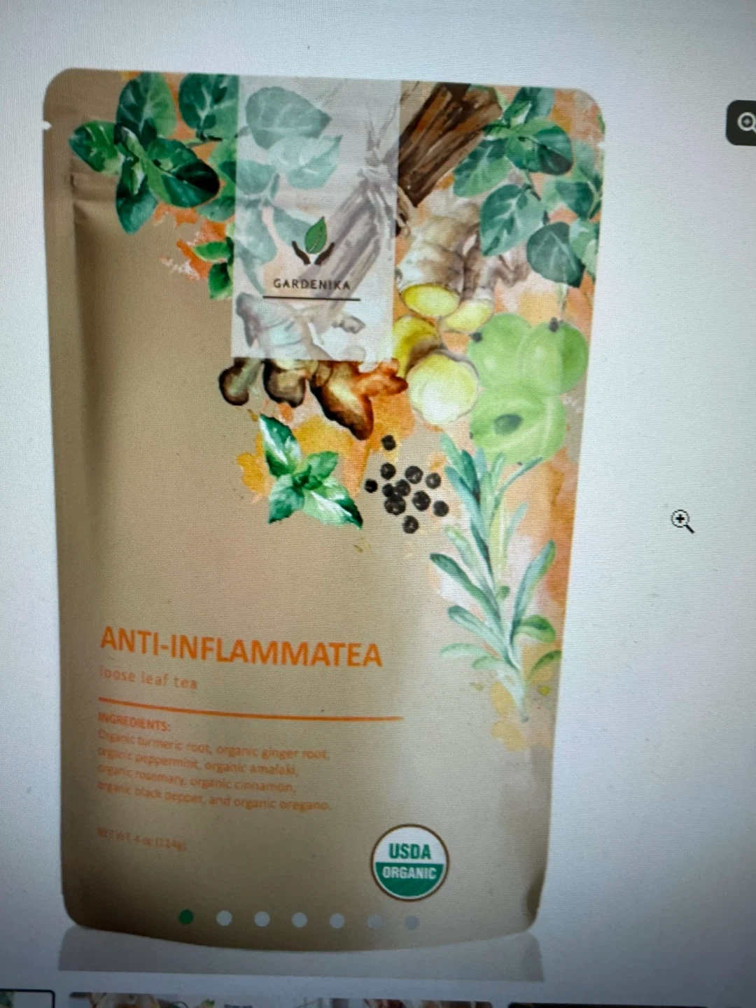 Was $15 each, Gardenika Anti-Inflammatea loose leaf tea! It's USDA organic, caffeine-free, and has no artificial flavors. It contains ginger root, turmeric root, peppermint, amalaki, rosemary, cinnamon, black pepper, and oregano