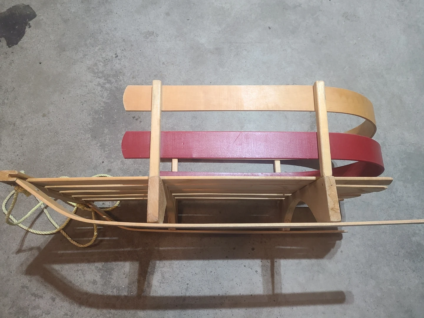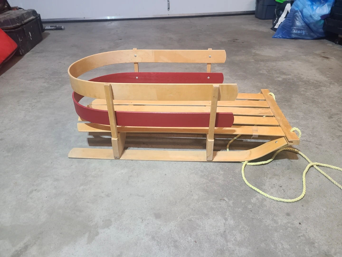 Selling a classic wooden sled! It's in great shape and ready for some winter fun. The sled features a sturdy wooden frame with red accents and a tow rope. Perfect for kids and adults alike to enjoy snowy days