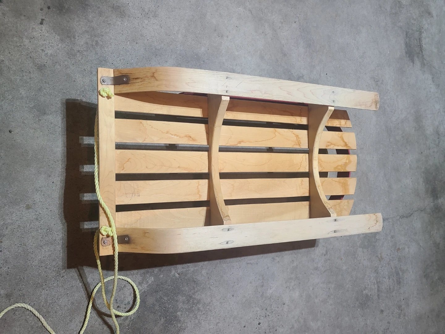 Selling a classic wooden sled! It's in great shape and ready for some winter fun. The sled features a sturdy wooden frame with red accents and a tow rope. Perfect for kids and adults alike to enjoy snowy days