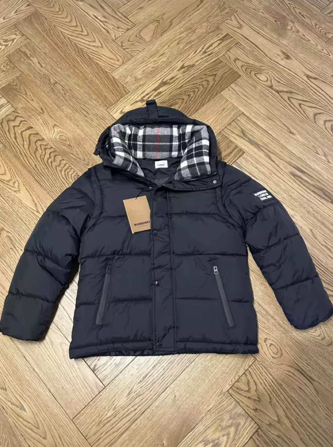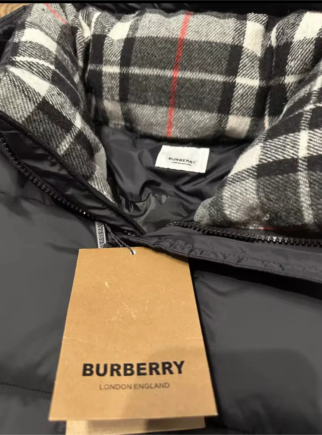 Here's a stylish Burberry puffer vest in black! It features a hood with a cool plaid pattern on the inside. Perfect for layering during those chilly days!